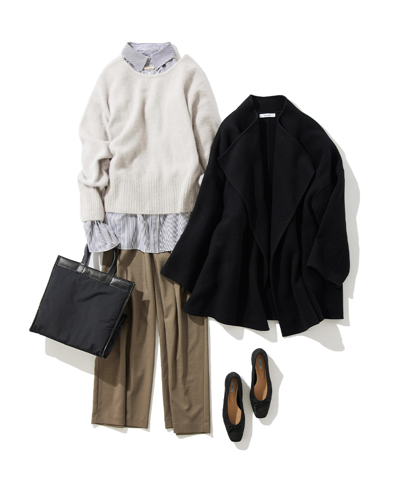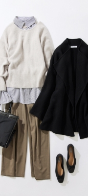 羽織るだけでサマ見えするハンドメイドコートは、軽くて暖かいこなれ感たっぷりの主役級コート。オンオフ着回し可能な毎年人気のフォックスウールニットに、-3キロ見えパンツでゆるっときれいめスタイリング。また袖フレアシャツを合わせて、単調になりすぎず抜け感をプラス。首元にはパールネックレスをプラスし華やかな印象に仕上げました。
