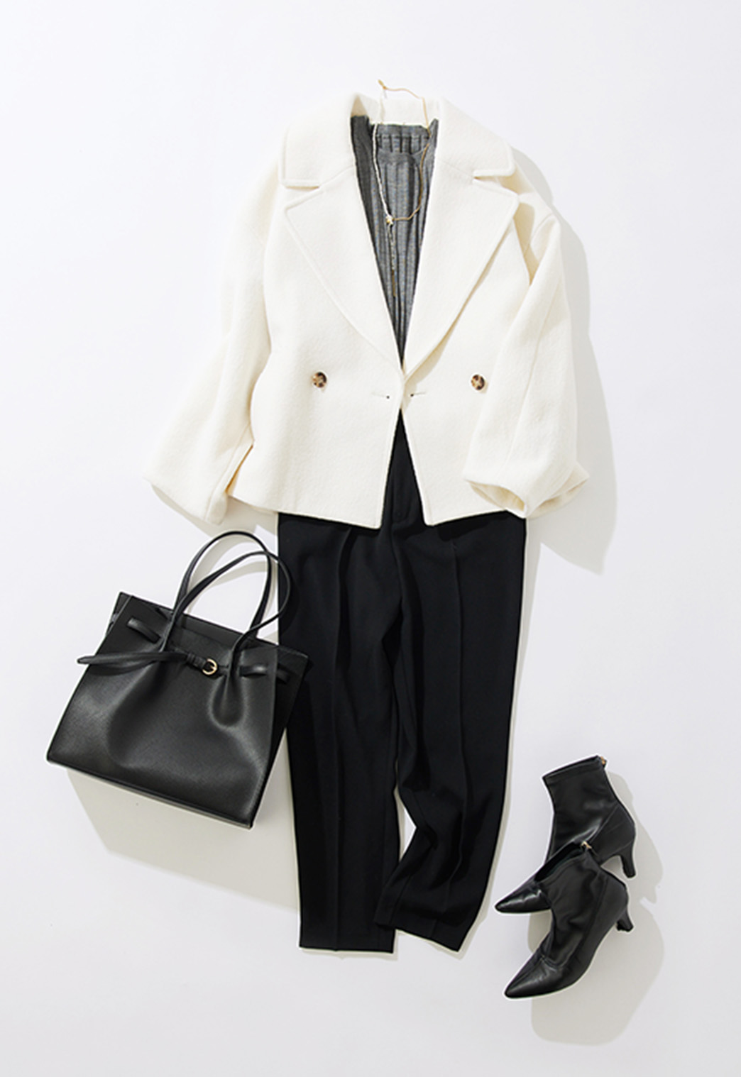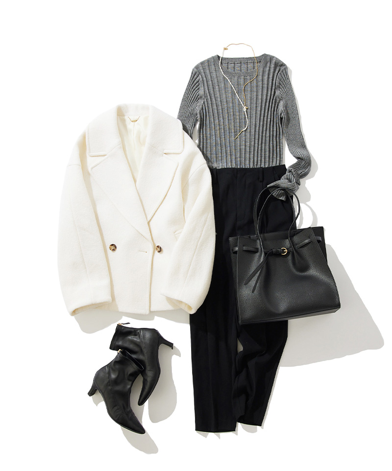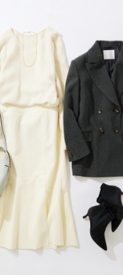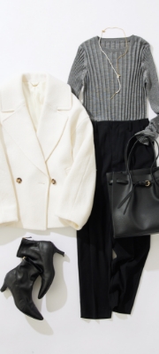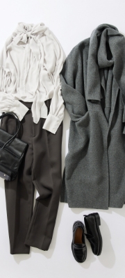 シーズンムードを高めるグレーカラーのトップスに、オンオフ兼用できる大人気のボトムスを合わせた、カジュアルすぎないスタイリングに仕上げました。きちんと感のあるコーディネートにホワイトのアウターで華やかさをプラスすることで、ほどよいバランスのオトナ通勤コーデに。