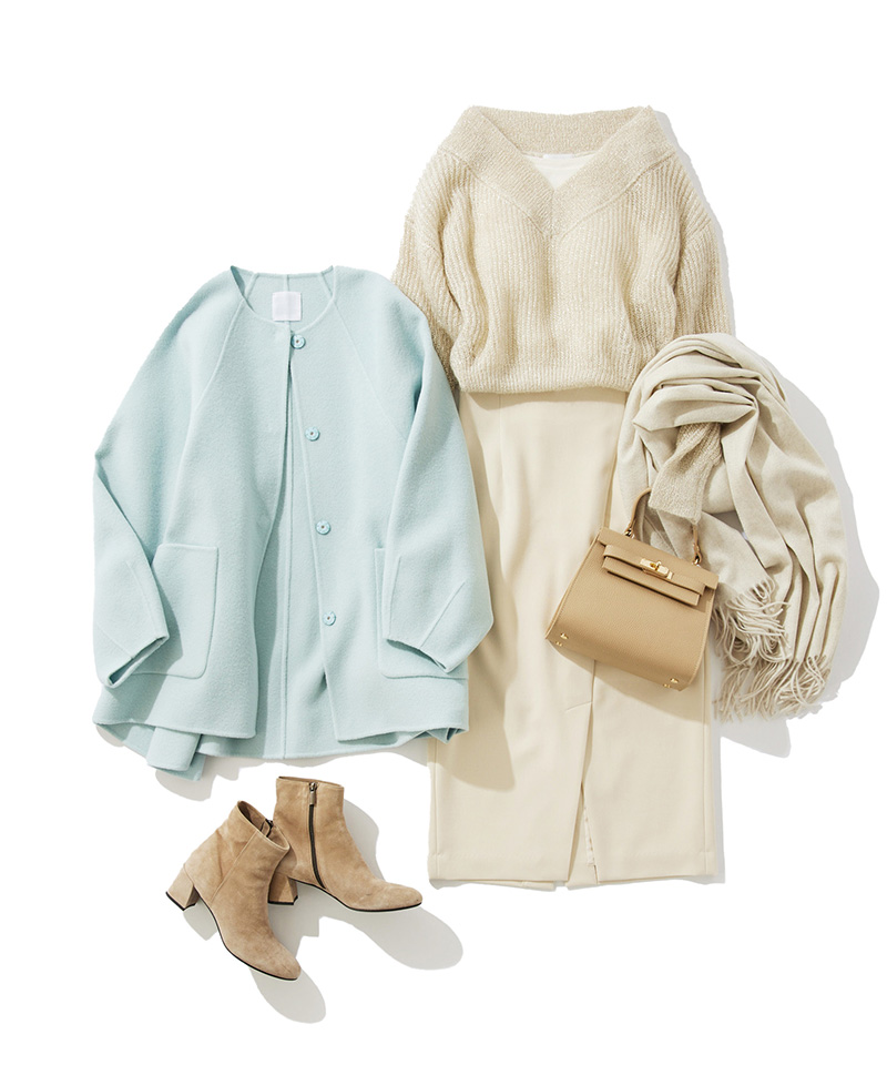 ふわふわ・きらきら・シアー・ラメ。シーズンキーワードが詰まった女子力UPのニットは、デコルテやうなじがきれい見えするVネックも魅力。キッドモヘアが入っているのでシアーでも軽くて暖か。着回し力抜群のフォルムが可愛いアウターと、美シルエットのナロースカートでオトナ可愛いあったか通勤着が完成。