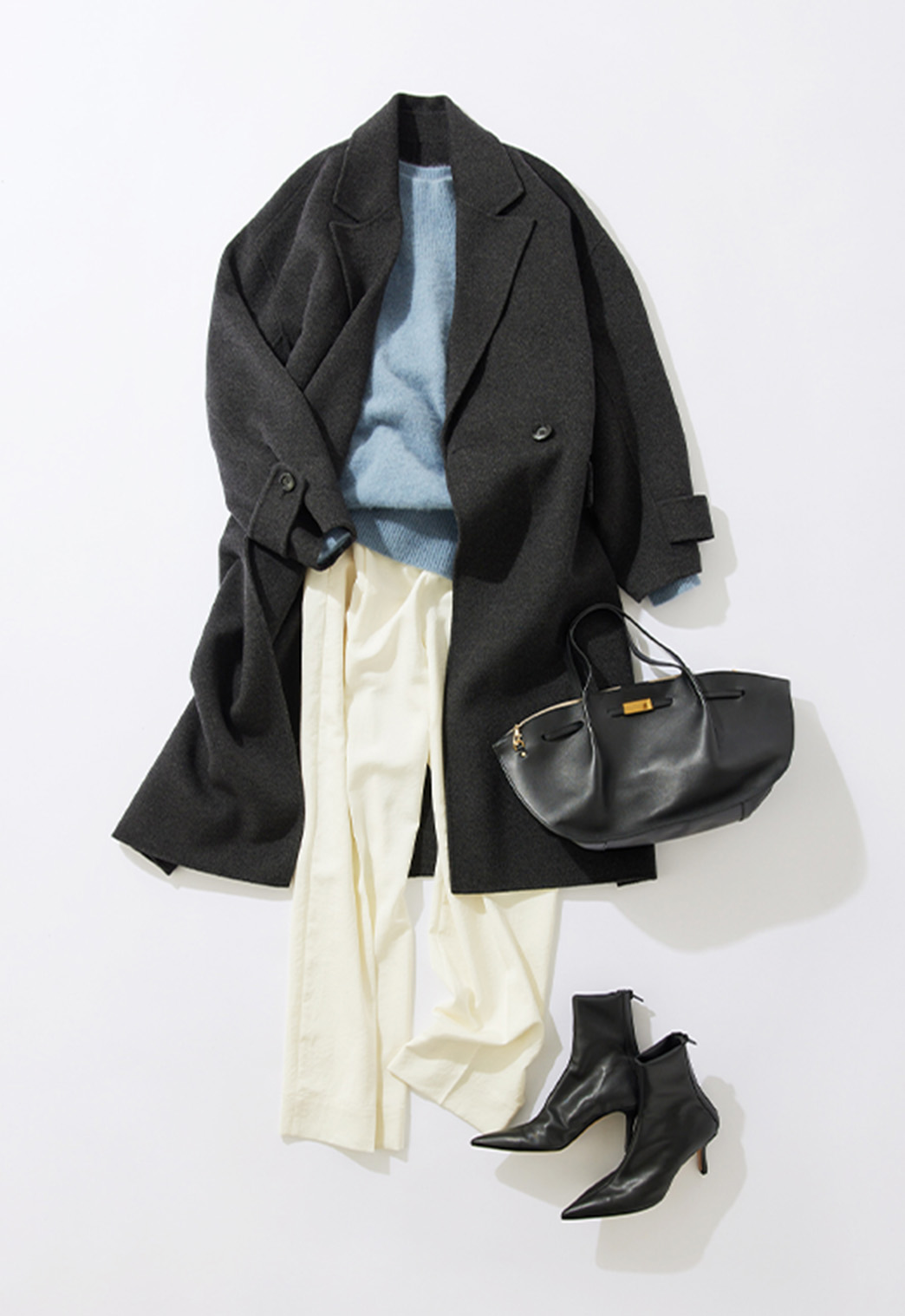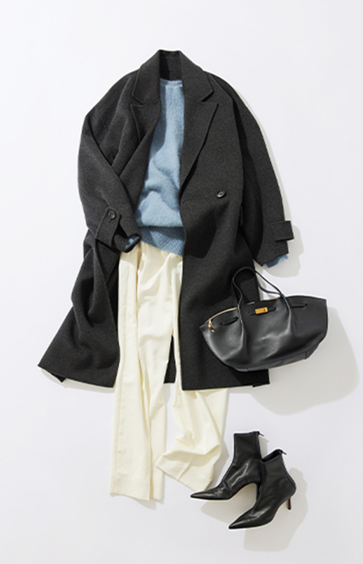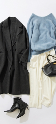 スタイリングを格上げしてくれる上質な素材のコートを主役にしたスタイリング。暗い印象にならないよう、オトナのカラーニットに艶のあるパンツを合わせました。また、タイムレスなデザインのコートはシーンやテイストを選ばないので、休日も大活躍間違いなしです。