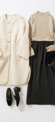 定番のボアコートを主役に程良く女性らしい通勤コーデに。インナーはシンプルなリブニットにジェナで毎年人気のキャタピラースカートを合わせました。スカートはALLゴム仕様でストレスフリー。足元はきれいめなローファーで女性らしさもプラス。オンオフ問わず着回せるアイテムです。