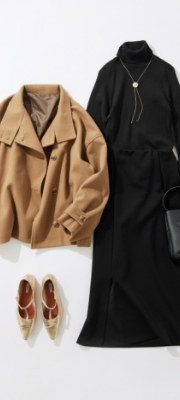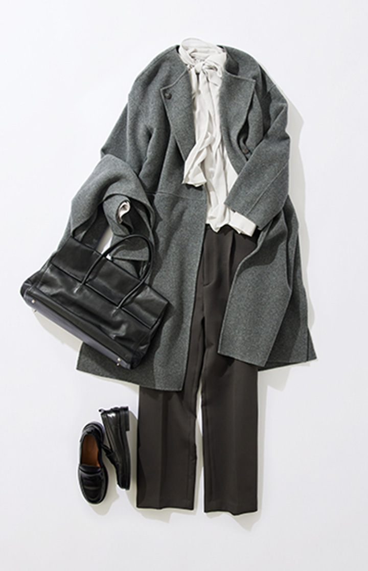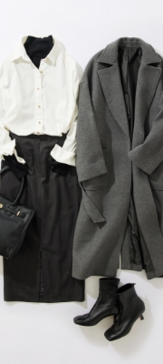 ラウンジドレスの定番通勤コーデ。今年はグレーのアイテムでまとめることで、定番だけど今っぽさを感じられるスタイリングに仕上げました。ベルト付きのロングコートとタイトスカートを合わせることで、縦のラインがきれいに見えタイルアップした印象に。シャツスタイリングもタートルネックをインすればあったか仕様に様変わりします。