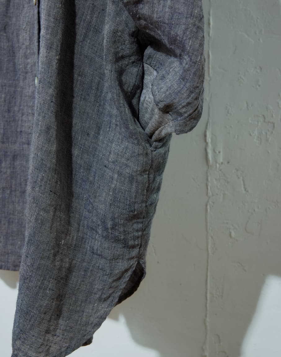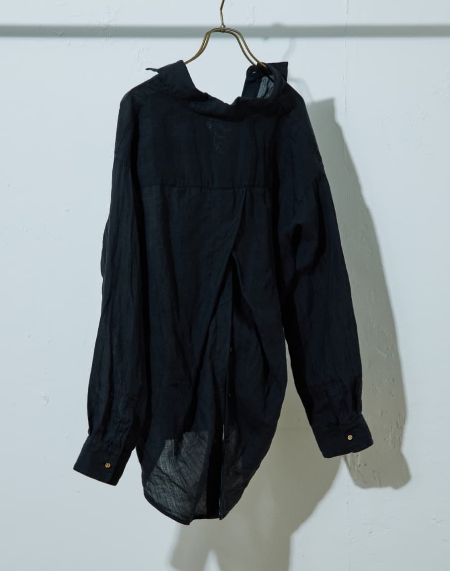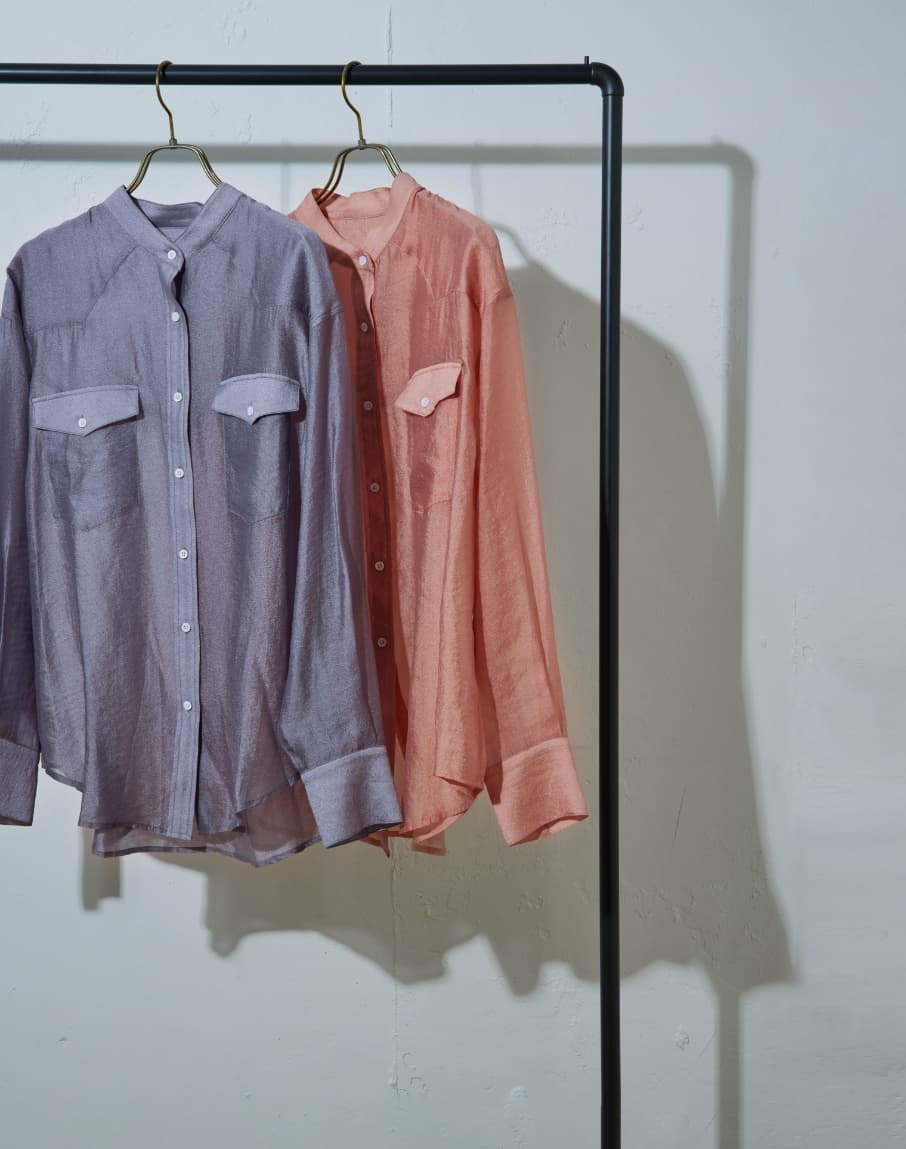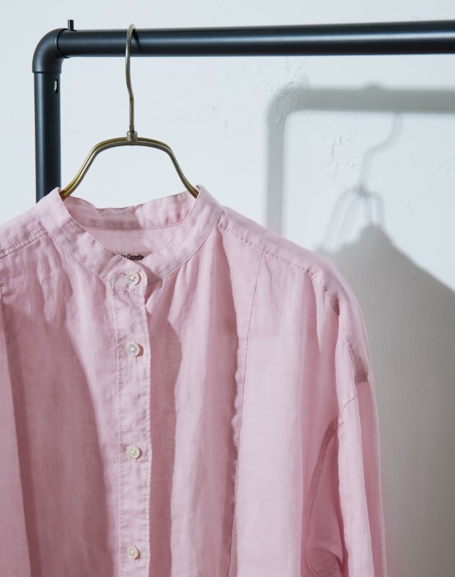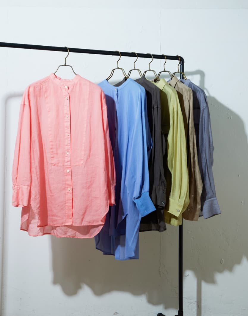 高番手のラミー素材を製品染めしたアイテムです。程よいシアー感と光沢感が上品さを演出しつつ、あえてくたっとした加工感を出すことでカジュアルな風合いに仕上げています。
