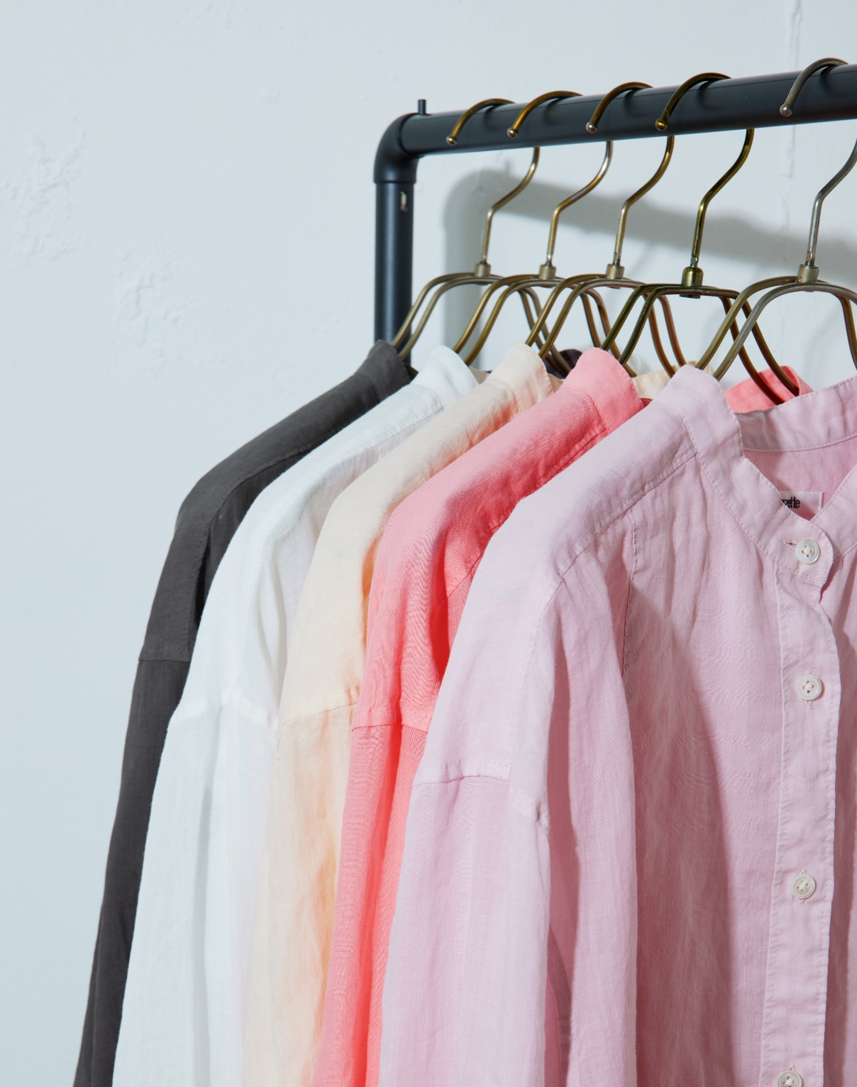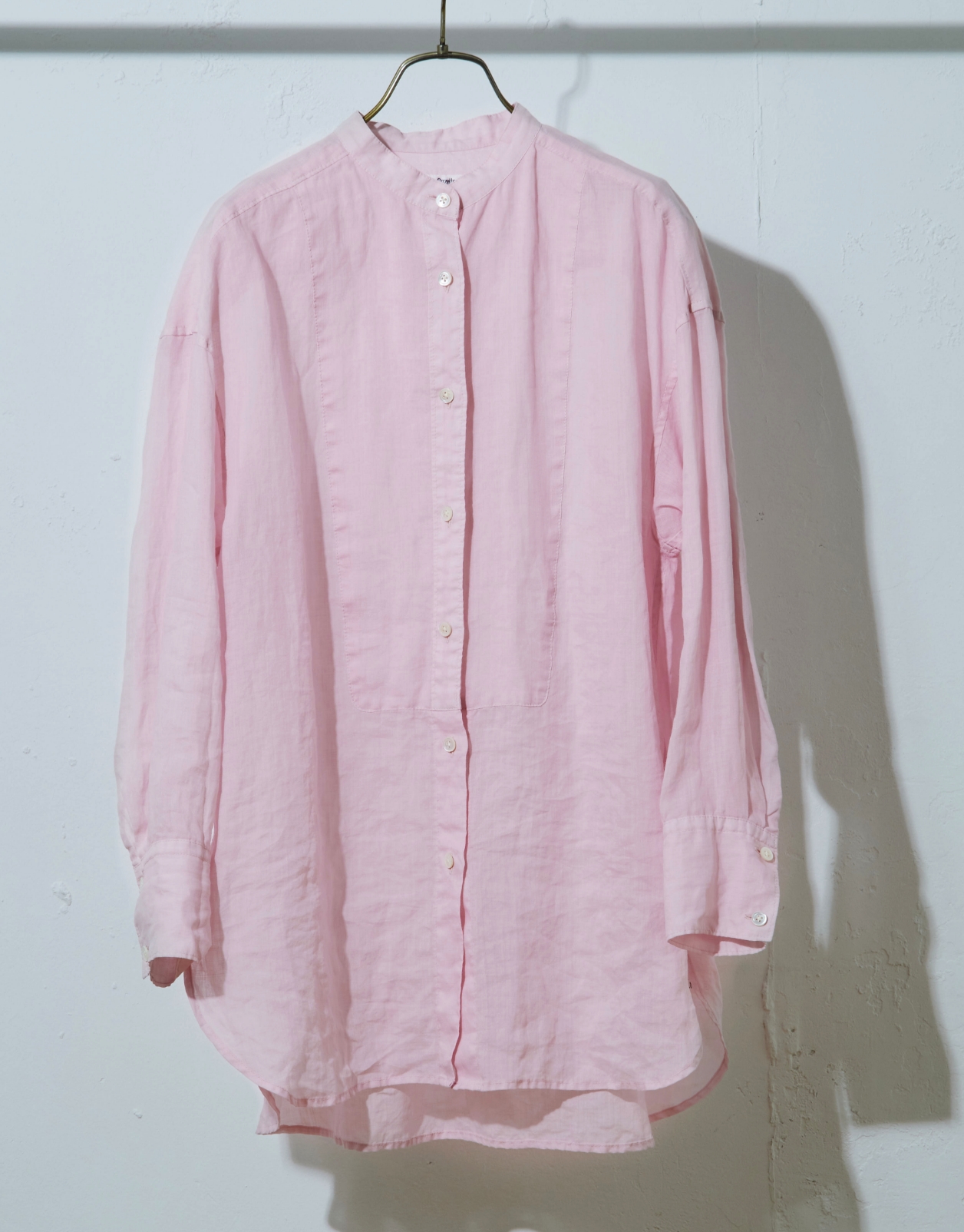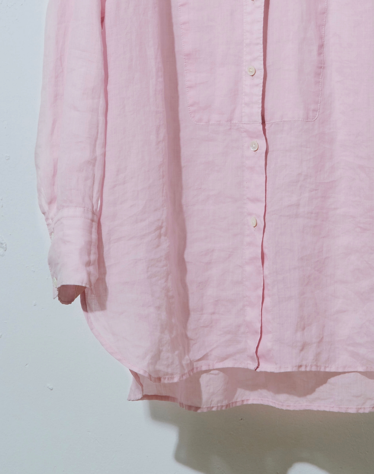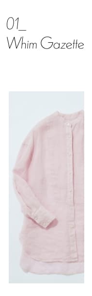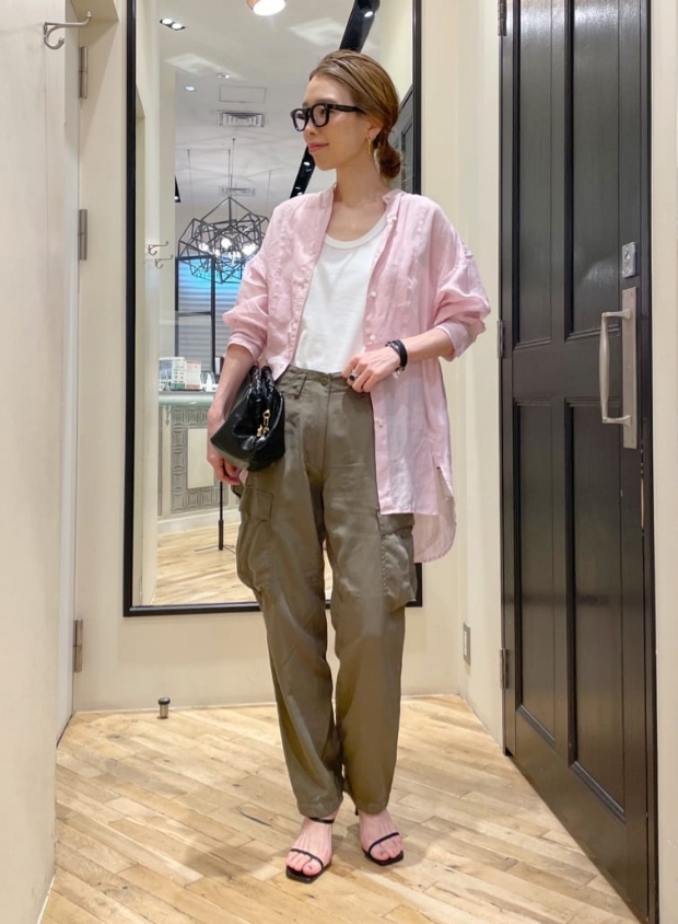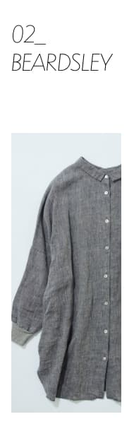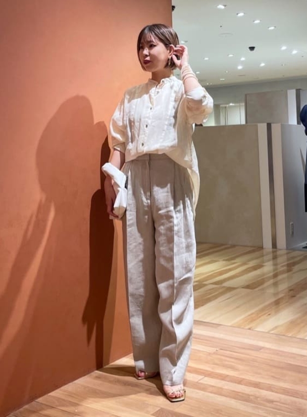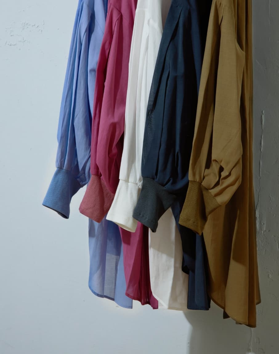 高番手のラミー素材を製品染めしたアイテムです。程よいシアー感と光沢感が上品さを演出しつつ、あえてくたっとした加工感を出すことでカジュアルな風合いに仕上げています。