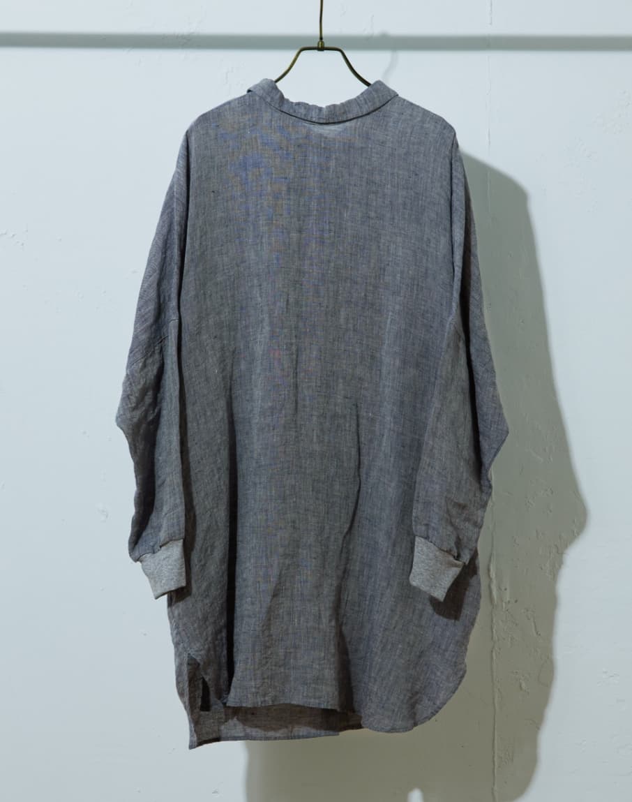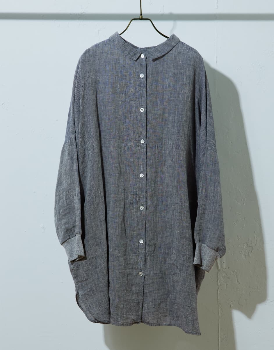 前後で着られるリネンシャツチュニック。 後ろボタンのチュニックとしても、前開きのハオリとしても着られる2WAY仕様です。 身頃はリネン100%でさらりと着られ、細身のパンツやレギンス合わせですっきりとしたスタイリングがおすすめです。羽織で着るときはインナーにタンクトップやTシャツをいれてワイドパンツを合わせると夏のリラックススタイルに。