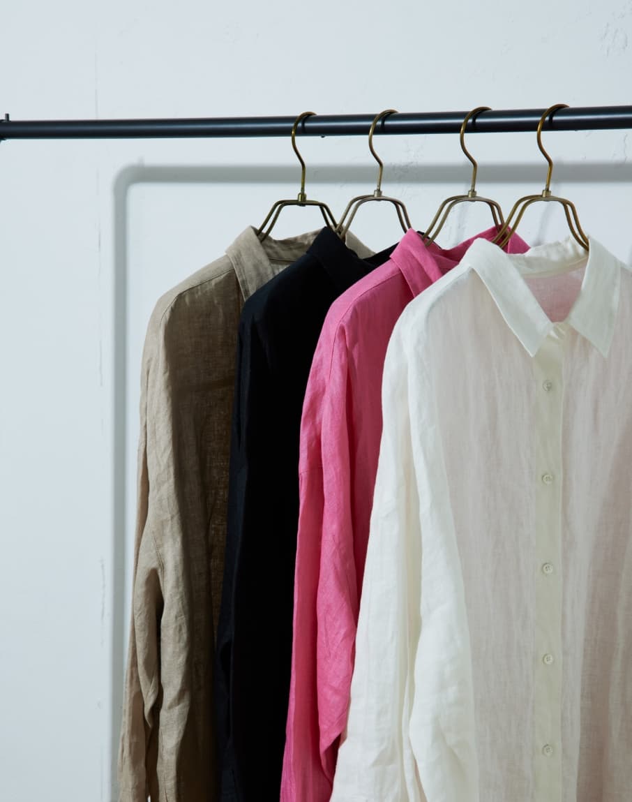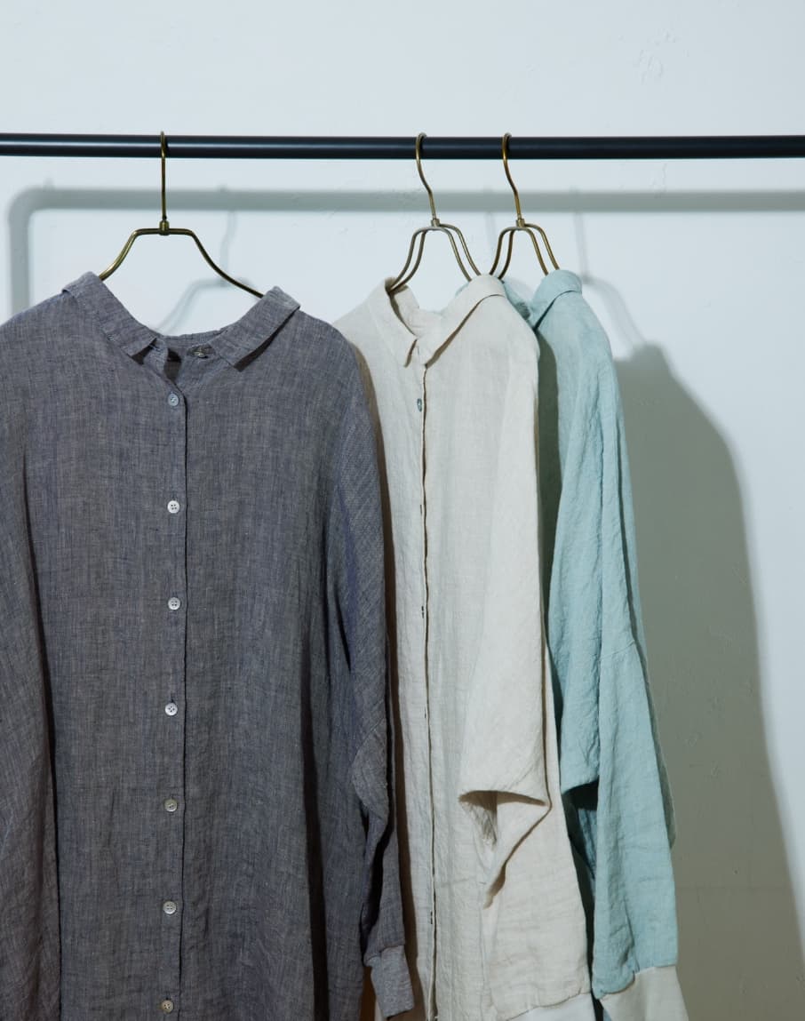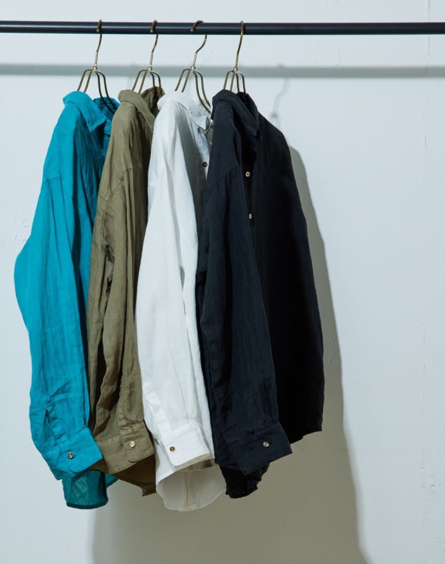 リネン素材のシャツは、夏の日よけとして羽織りとしてもお使いいただけますし、シンプルなスタイリングのアクセントに、肩や腰に巻いたりするのもおすすめです。