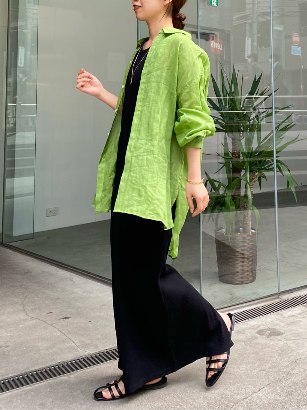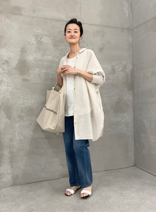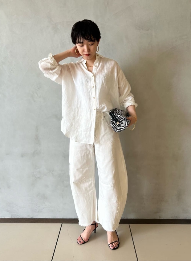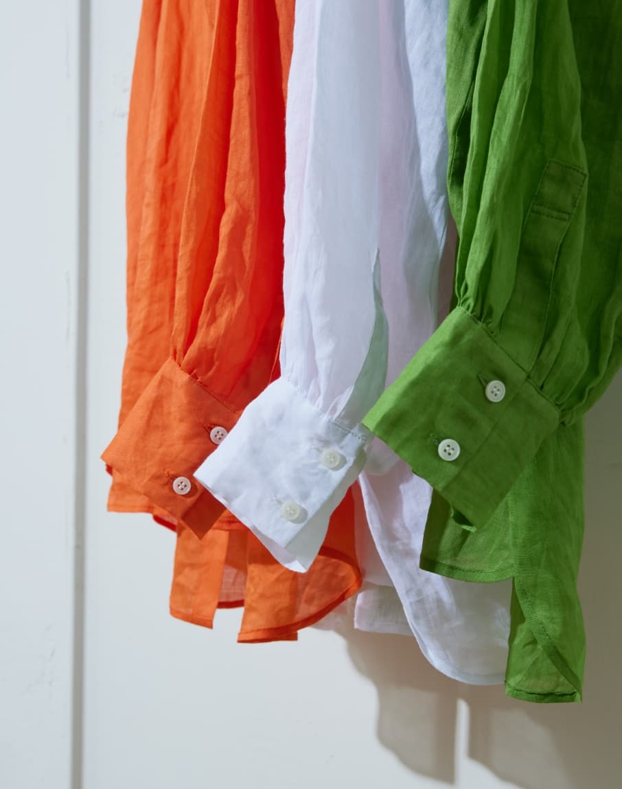 リネン素材のシャツは、夏の日よけとして羽織りとしてもお使いいただけますし、シンプルなスタイリングのアクセントに、肩や腰に巻いたりするのもおすすめです。