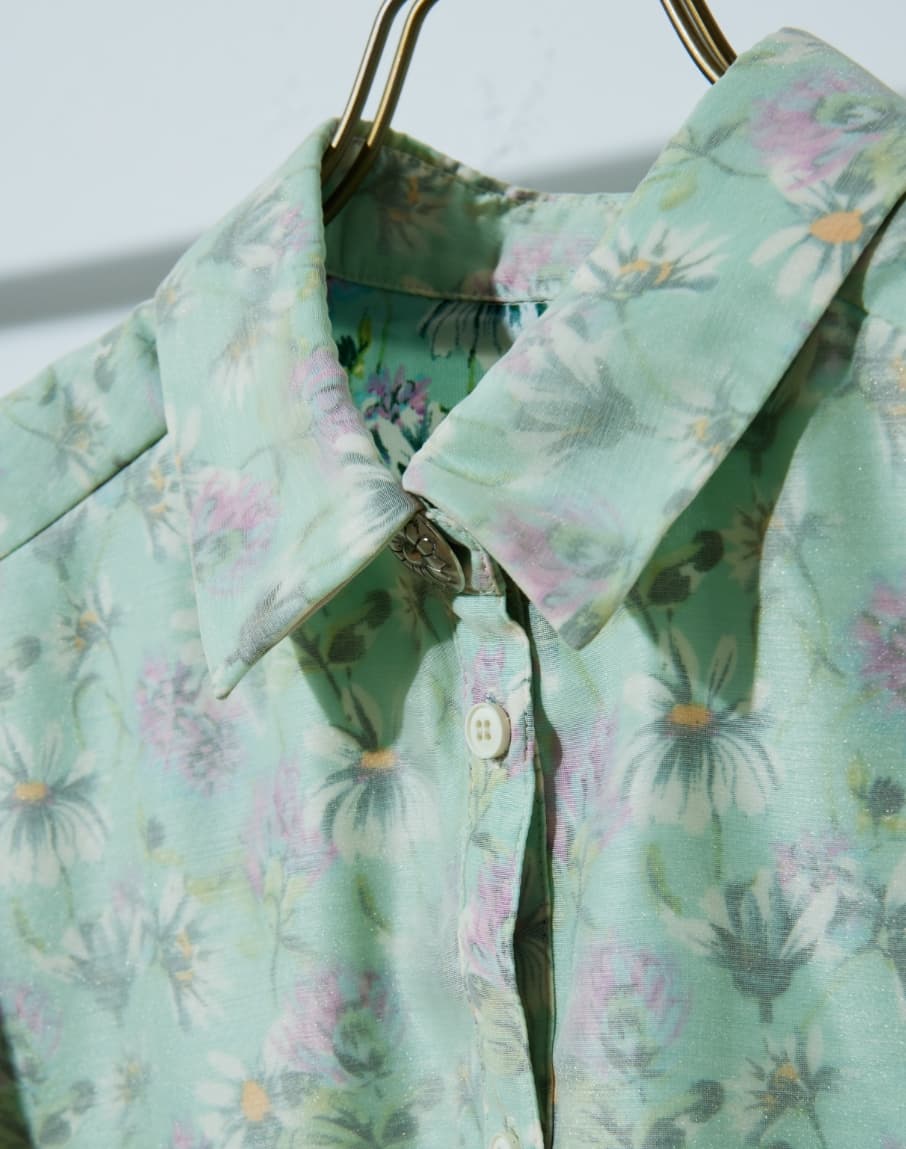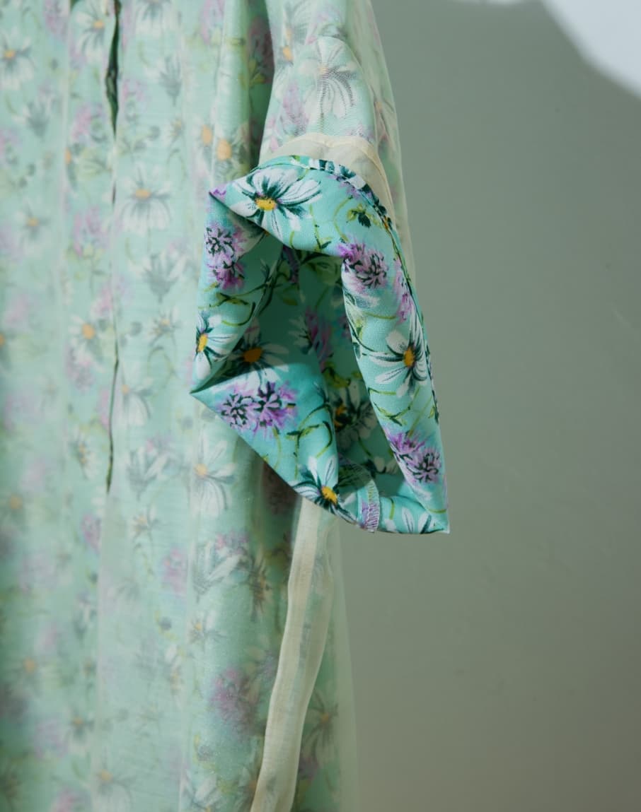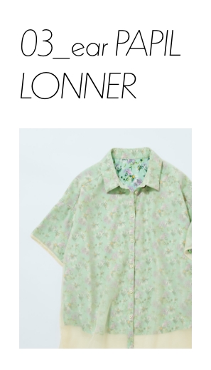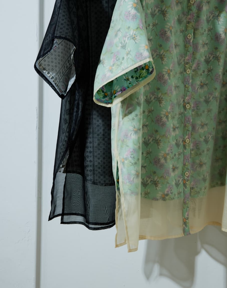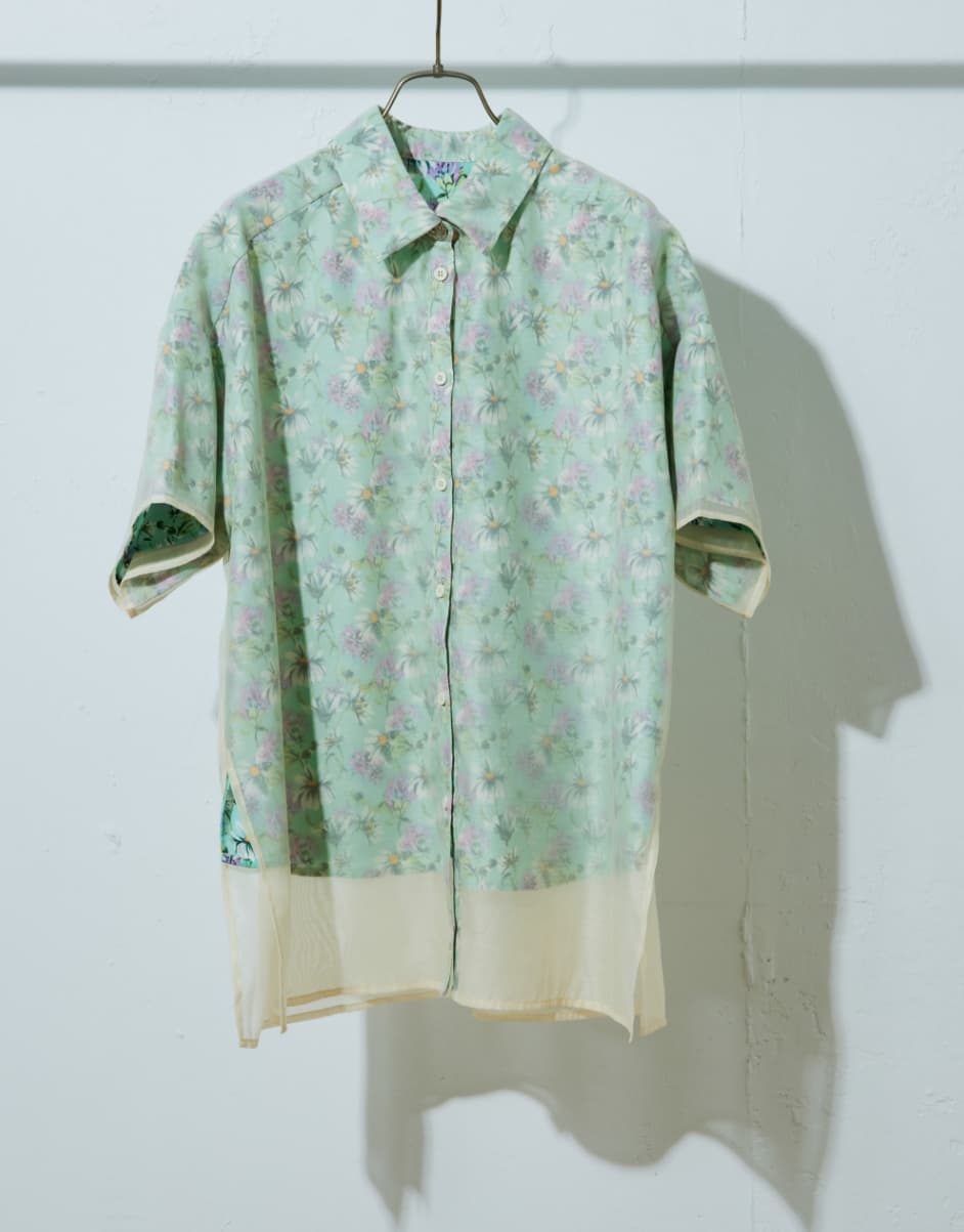 花柄とシアーの生地を2枚重ねたレイヤード風デザイン。あえて裾の長さを変えていることで脚長効果あり。袖をロールアップして柄を表に見せるアレンジも◎