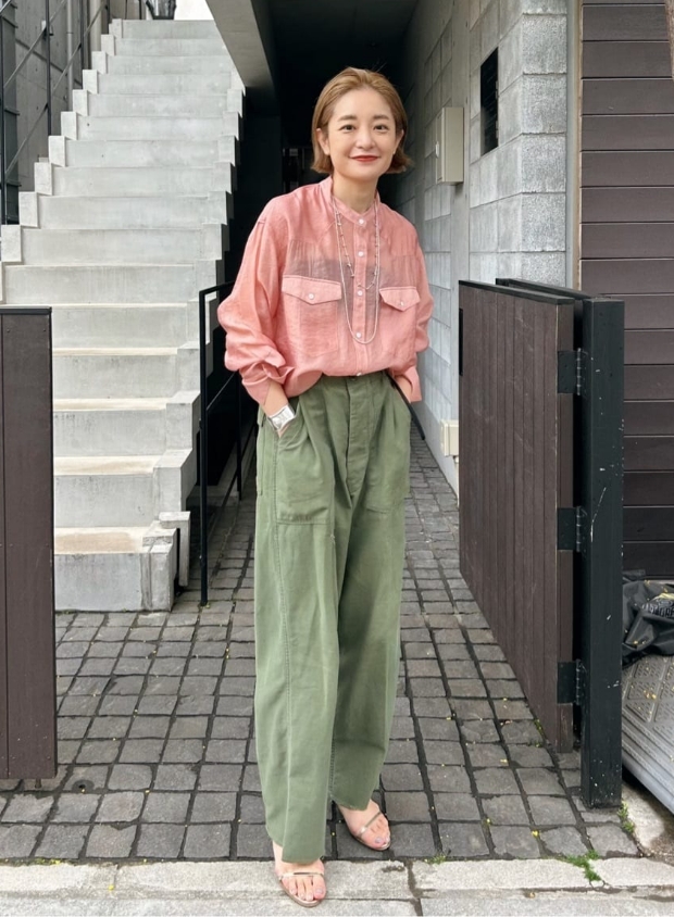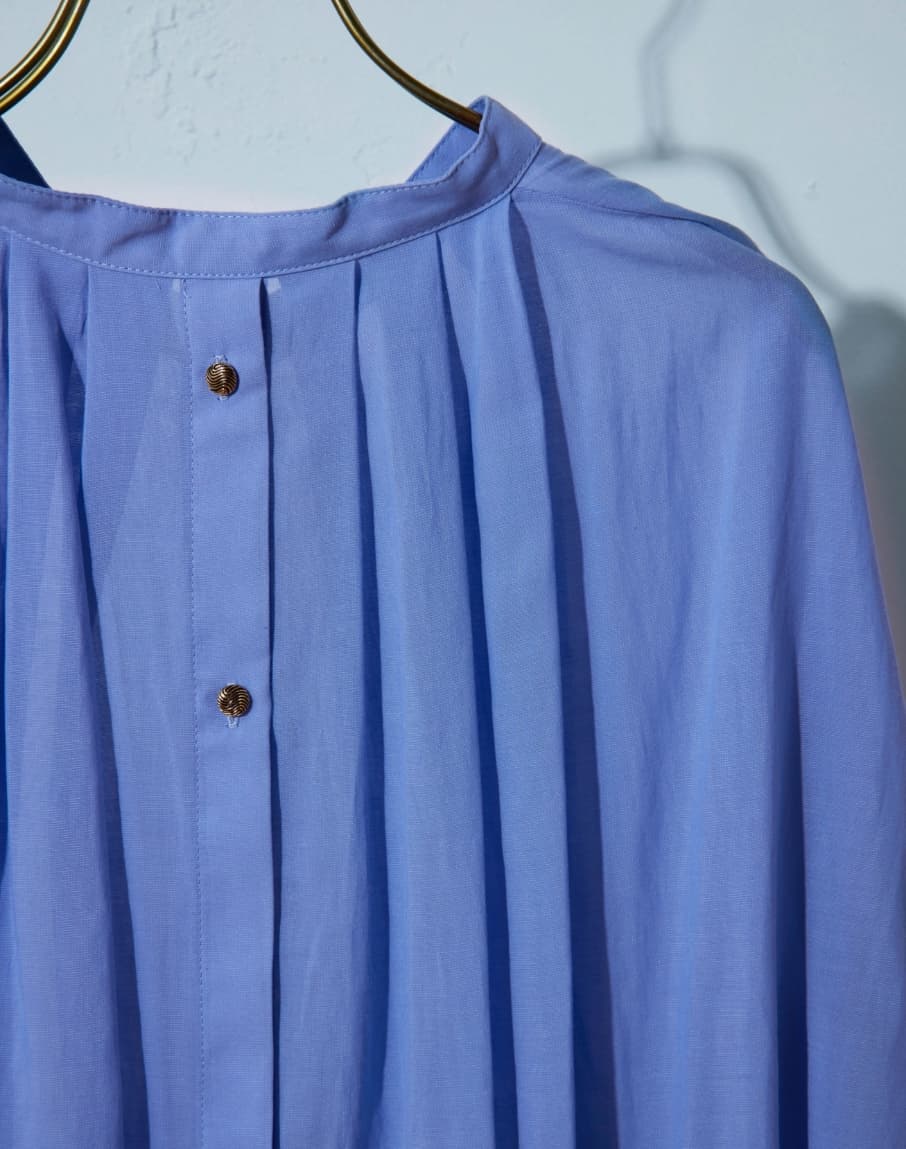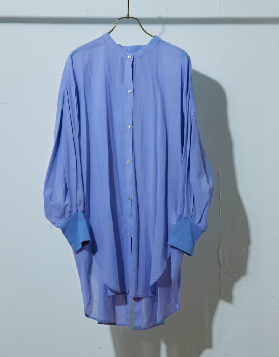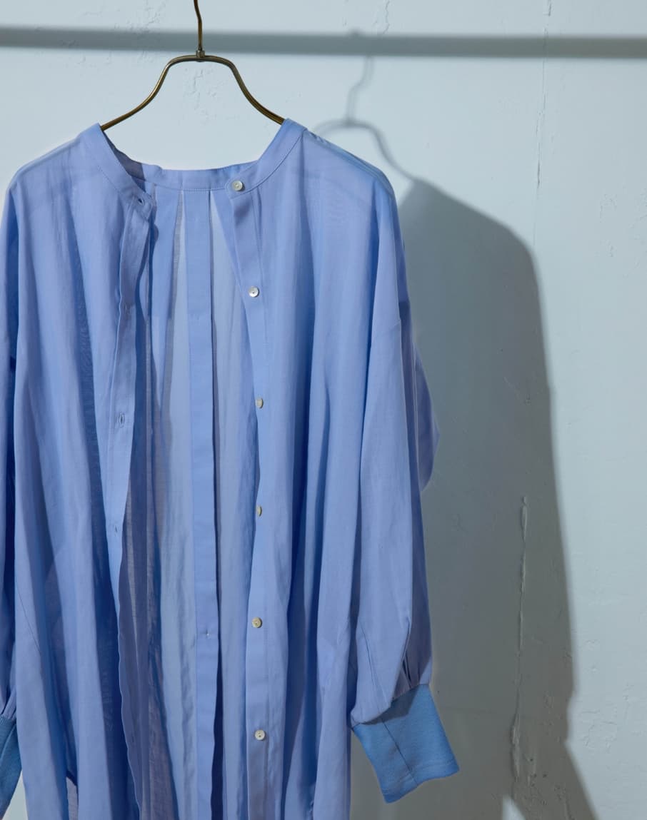 程よいハリ感のある素材で夏も涼しく、バンドカラーなので襟元もすっきりと女性らしく着れるところがポイント。