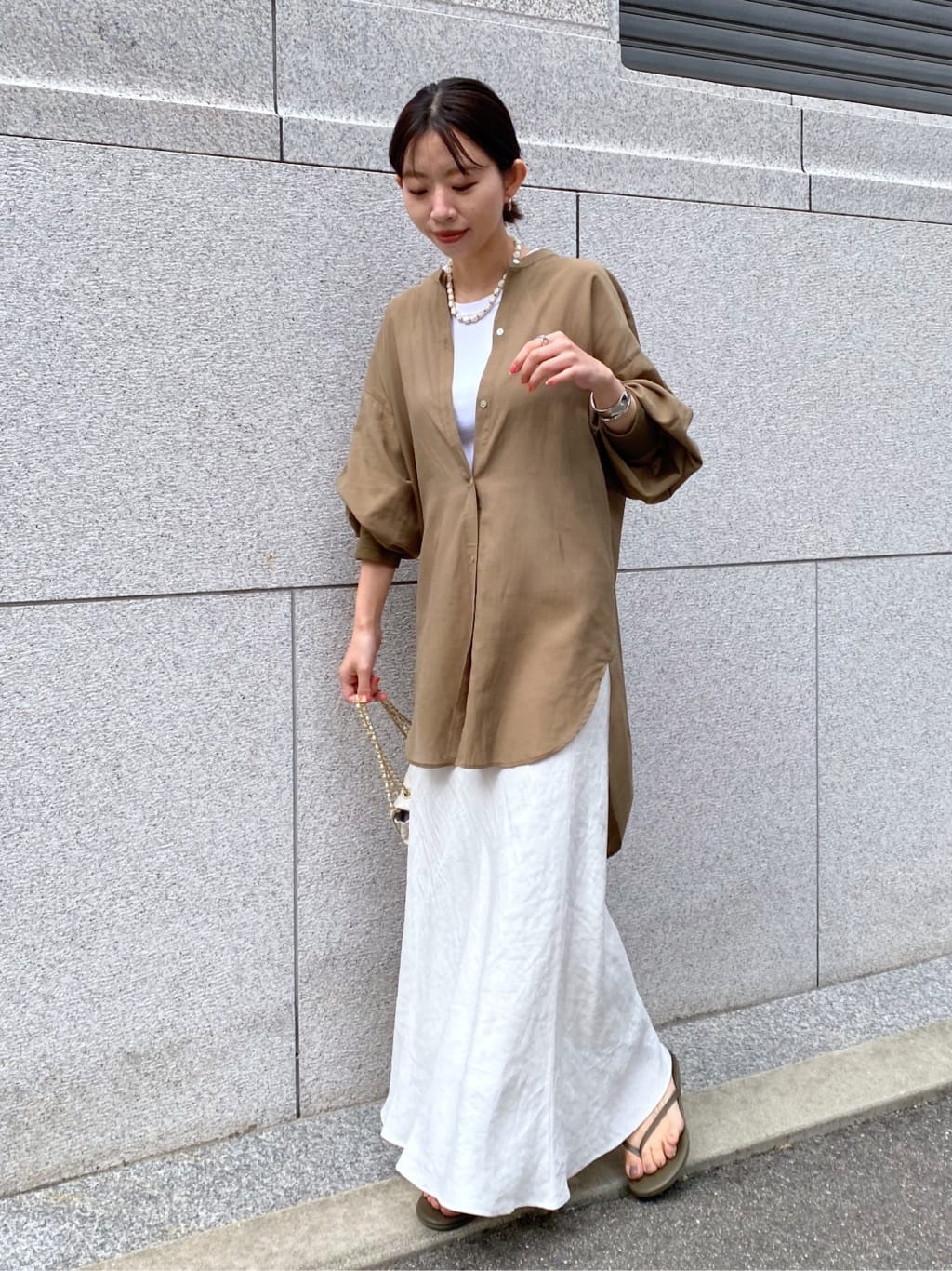 バックの裾部分のボタンを外すとスリットが入れられる仕様で、気分に合わせてアレンジして頂けます。さっと1枚着ても様になり、インナーにキャミソールなどをレイヤードし羽織としても使える万能な着回し力の高いアイテム。