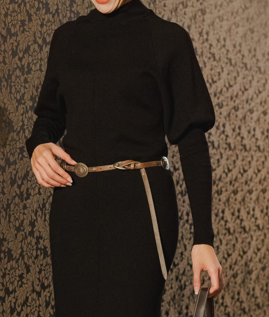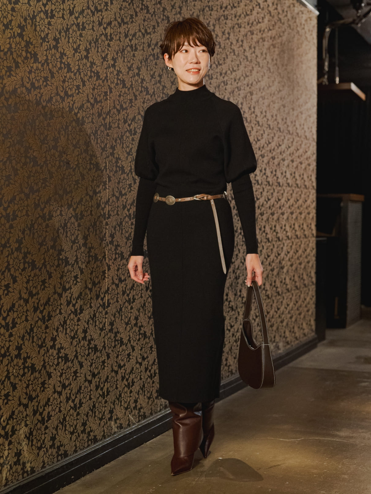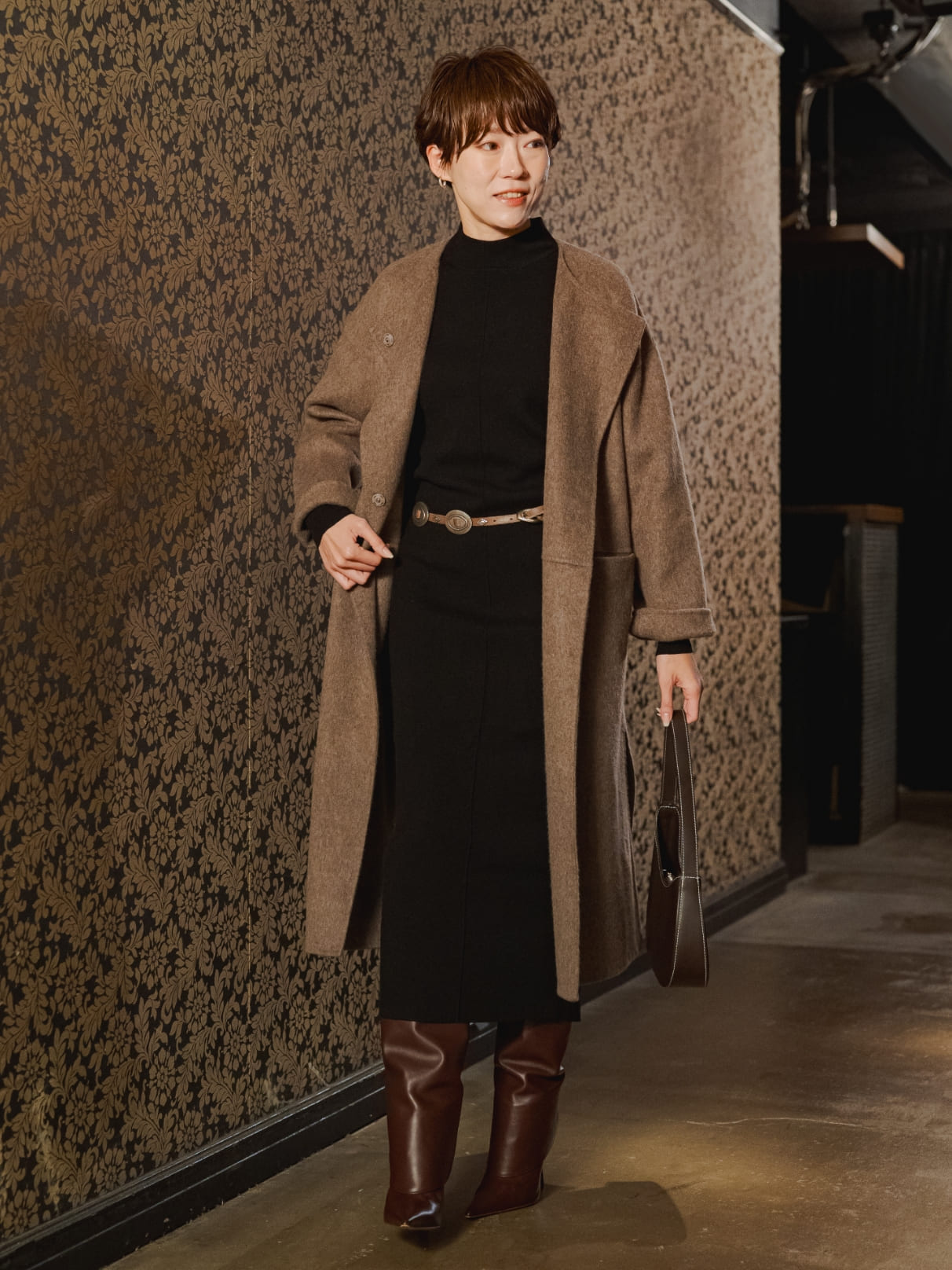 着席のシーンでも華やぐよう、パフスリーブがアクセントになったワンピースをセレクト。どの骨格タイプでもきれいにみえるワンピースで、オトナな雰囲気を演出しました。ニット素材ですがスムースのしっかりとした編地なので、カジュアル感は控えめです。アウターはカシミヤタッチの上質なリバーコート。同素材のストールと合わせることでクラス感のあるスタイルになります。