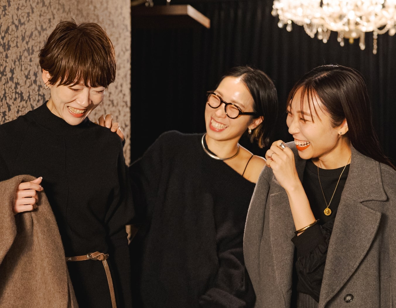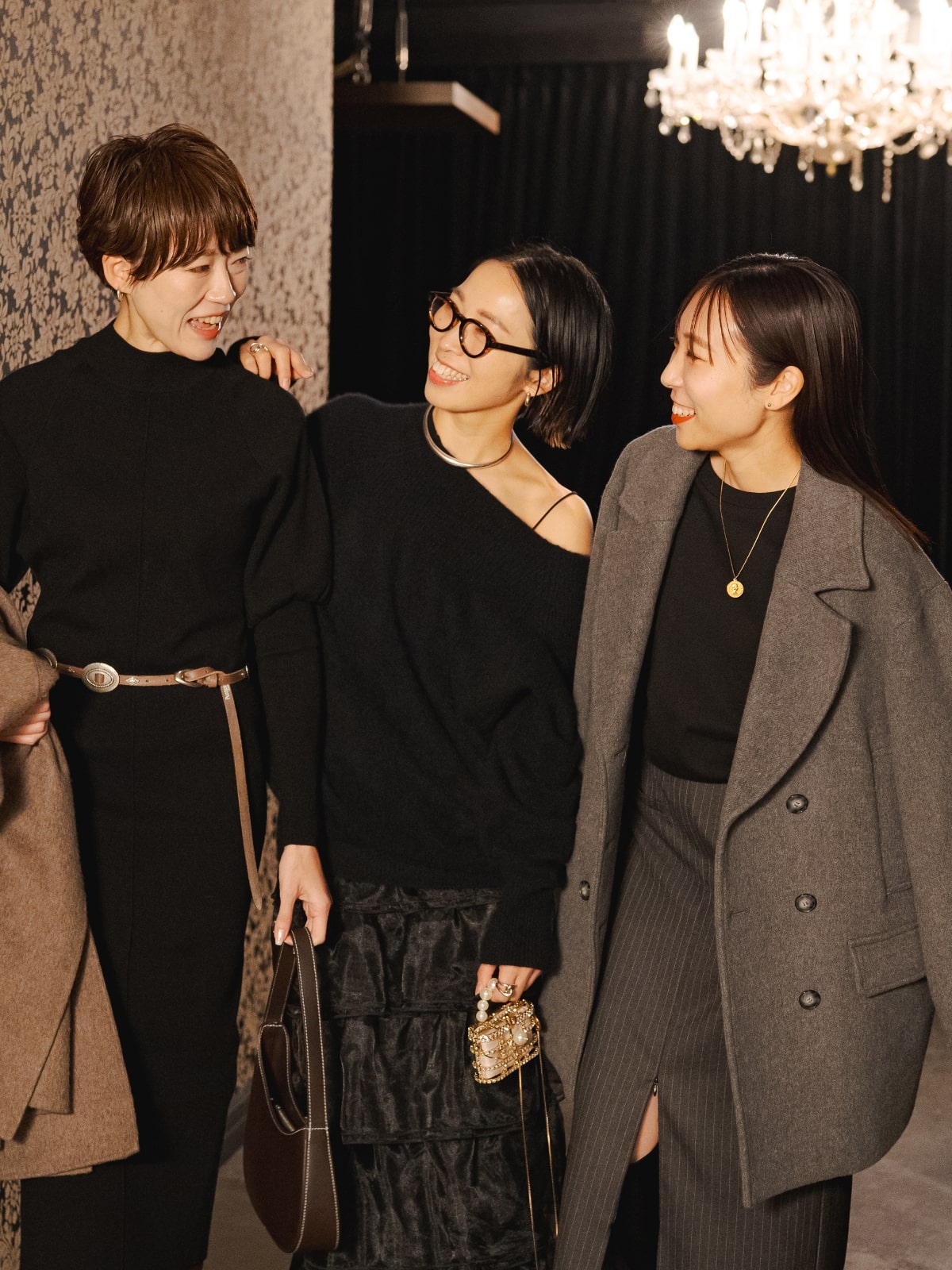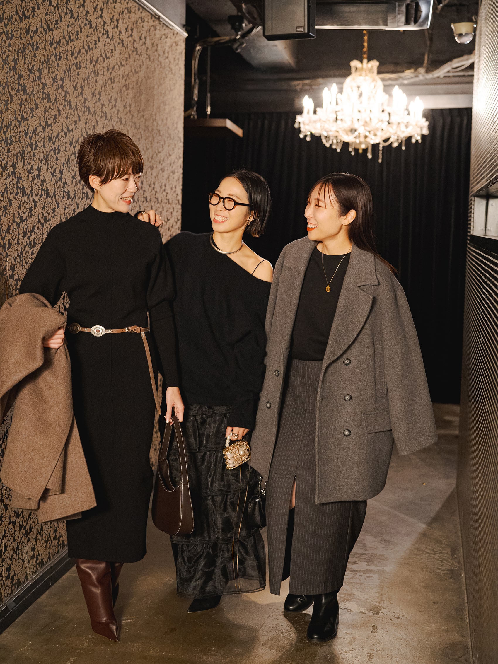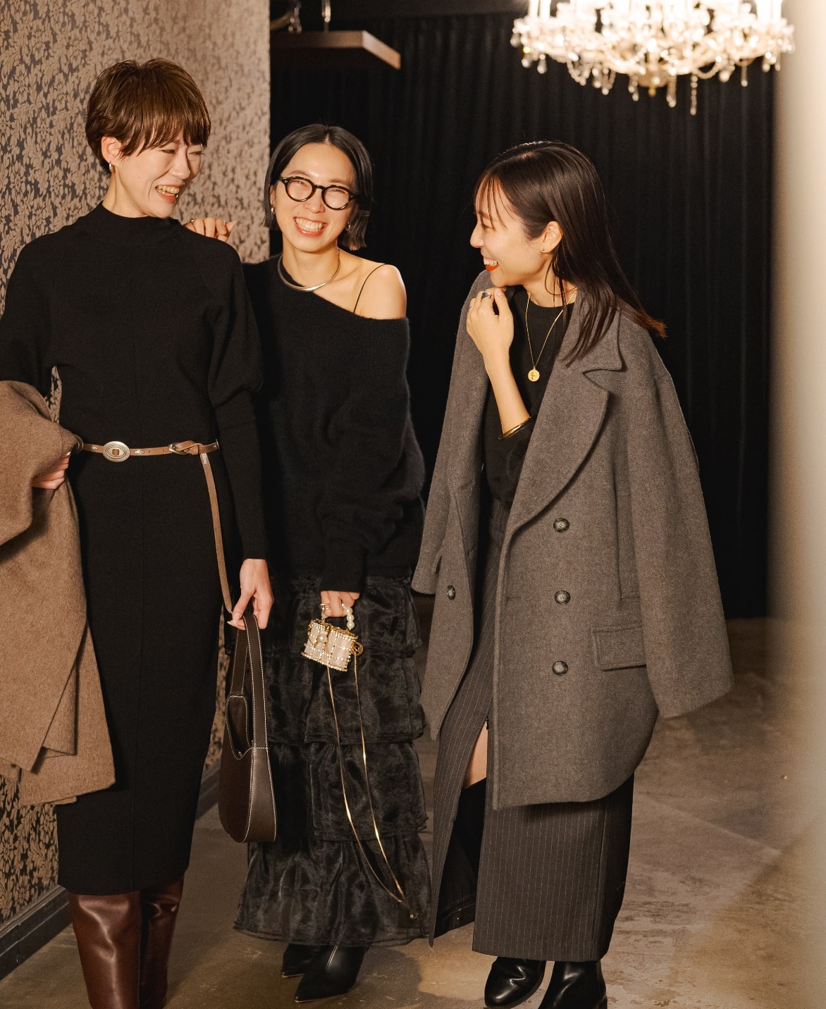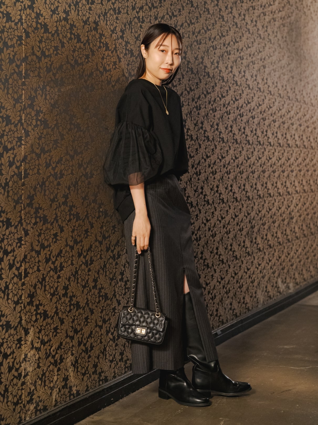 オーガンジーのスカートを主役に、ハンサム女子でも着られる毛足の長いニットでヘルシーな肌見せをしつつ、足元はポインテッドトゥブーツでスタイリッシュな印象に。リッチなシーンの女子会では、一点で豪華な小物を持つことで、さらに華やかさを演出できます。