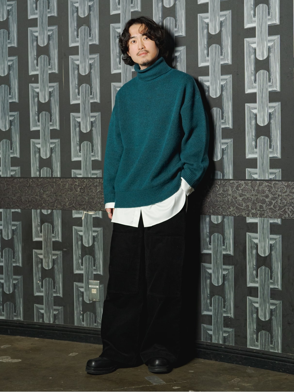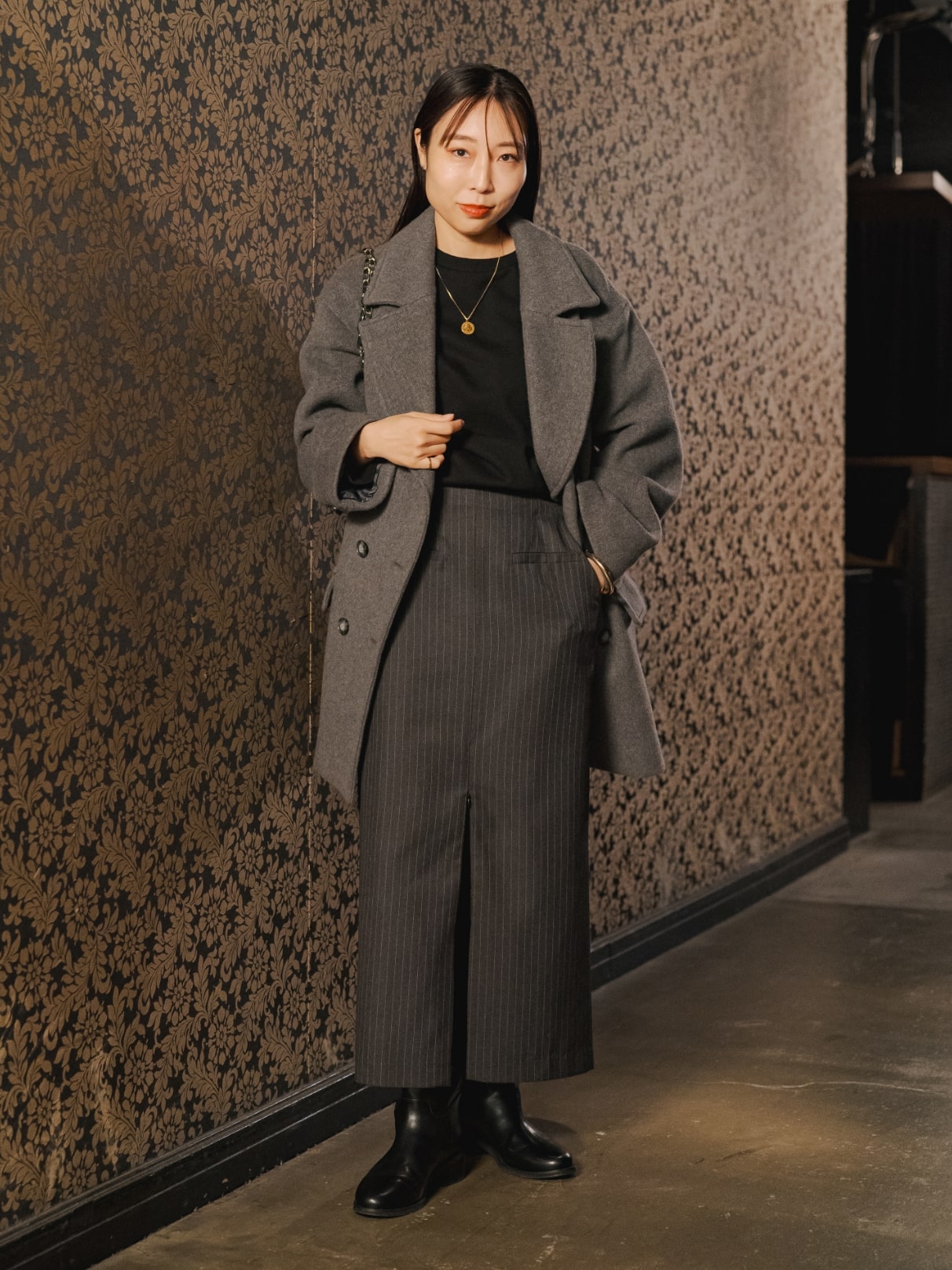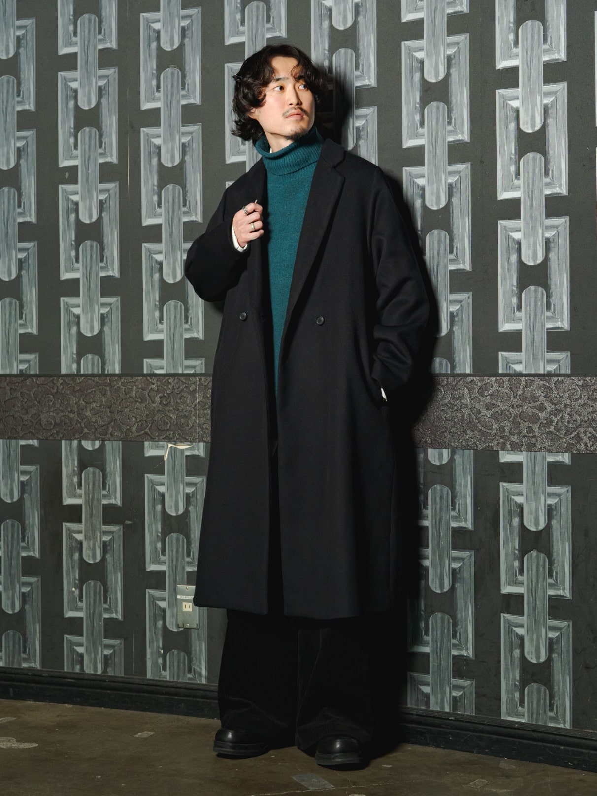 全体的にブラックで統一したコーデ。シルエットにゆとりがあり、着丈の長い綺麗な雰囲気のコートに、重くなりすぎないようにインナーは色物のタートルニットに白シャツをレイヤード。特別なシーンにおすすめなコーディネートです。