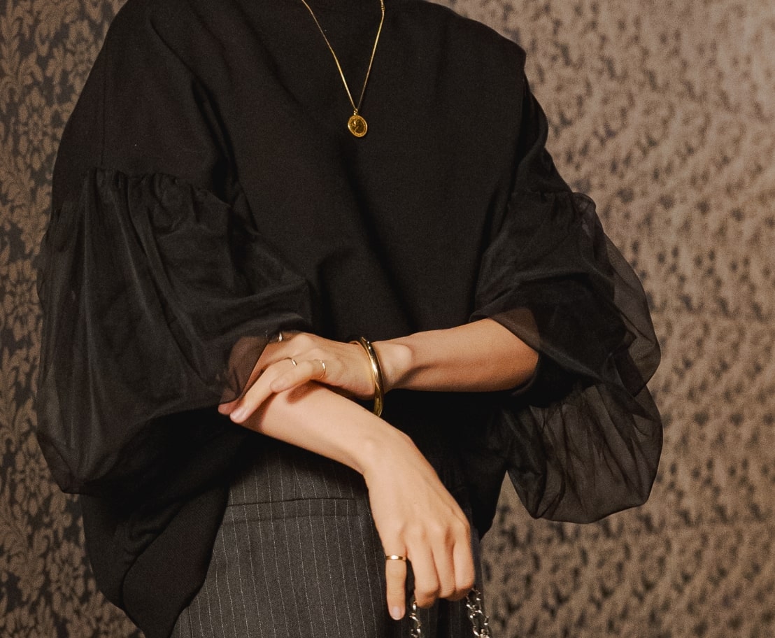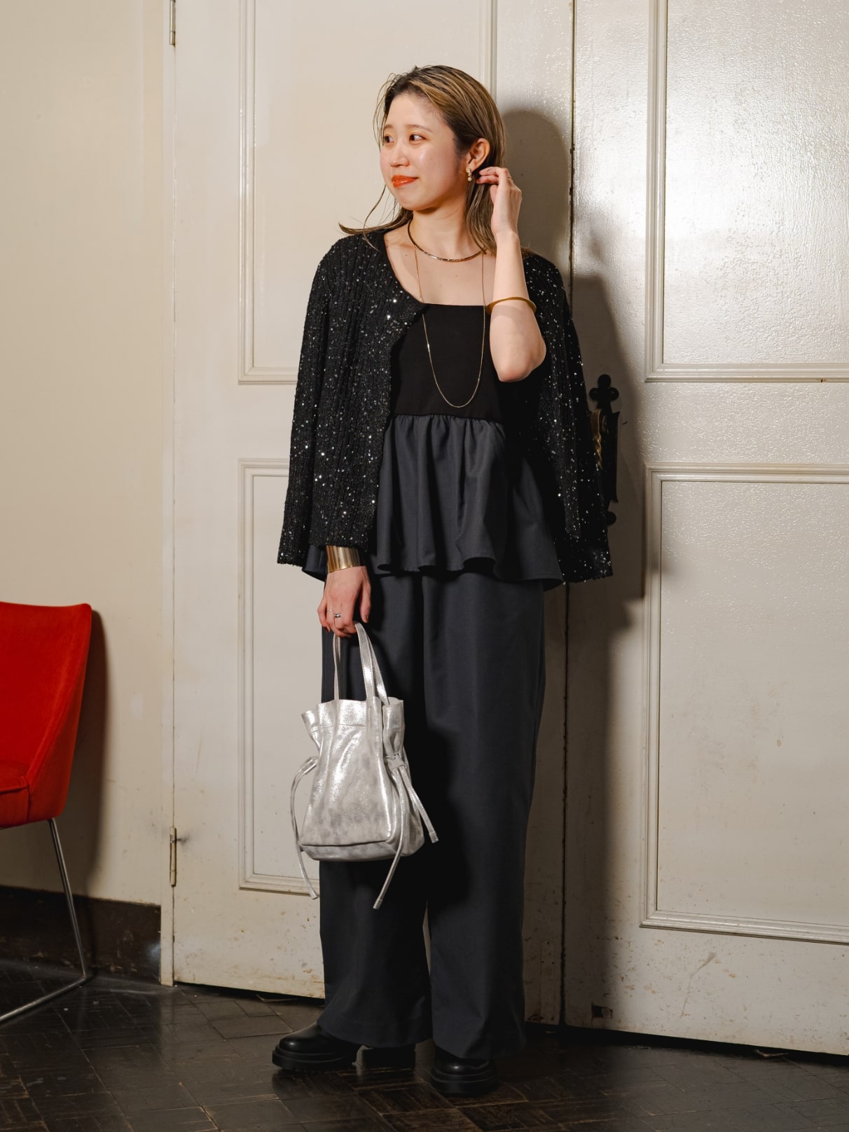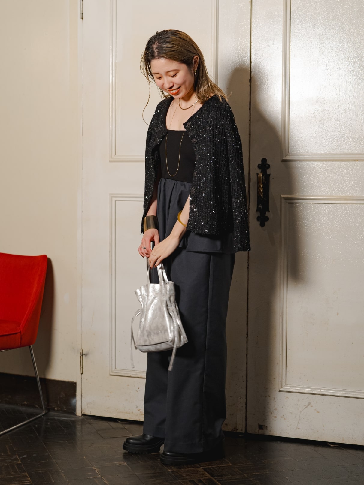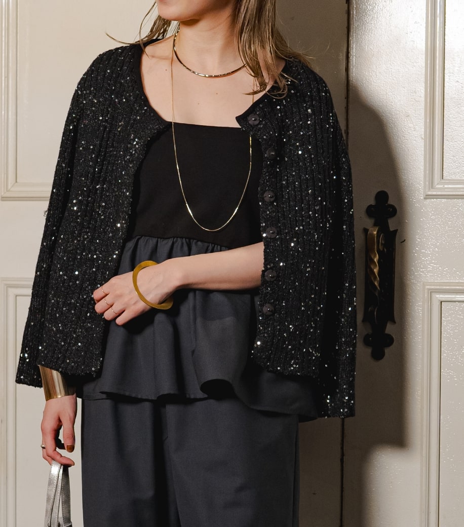 今季トレンドのグレートーンのセットアップに、キラキラ光るスパンコールがポイントのニットカーデを合わせて、トキメキを詰め込んだ華やぎコーデに。ゴールドのアクセサリーを重ね付けすることで抜け感をプラス。写真映え間違いなしの、女性らしさと遊び心もあるオトナな女子コーデに仕上げました。