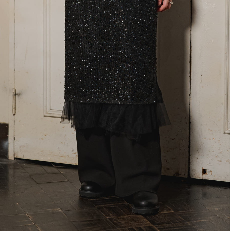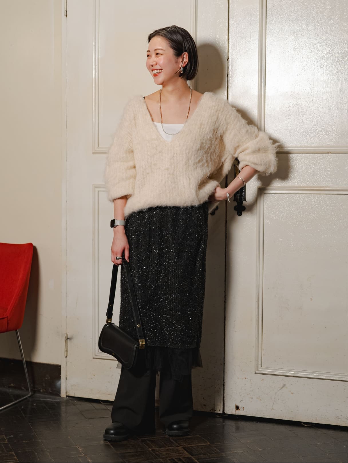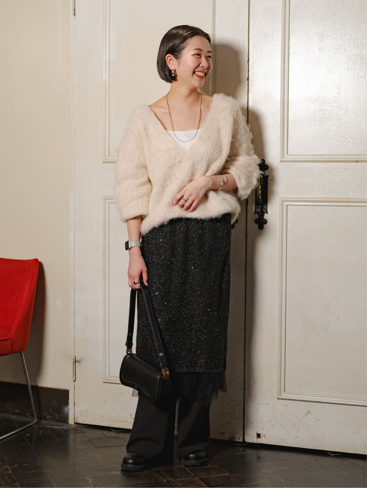 トレンドのシャギーニットにビーズとスパンコールをあしらったチュールスカートを合わせて、ワンランク上のオシャレ女子会スタイルに。ボトムはワイドパンツをあえてレイヤードし、足元はサイドゴアブーツをプラスすることで抜け感を演出しました。普段とは一味違う、華やかなシーンにぴったりなカジュアルコーディネートの完成です。