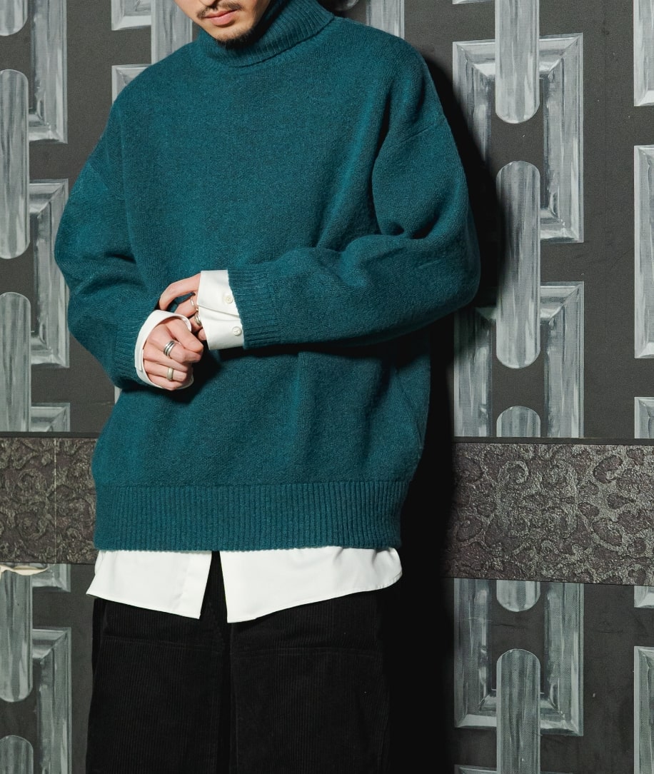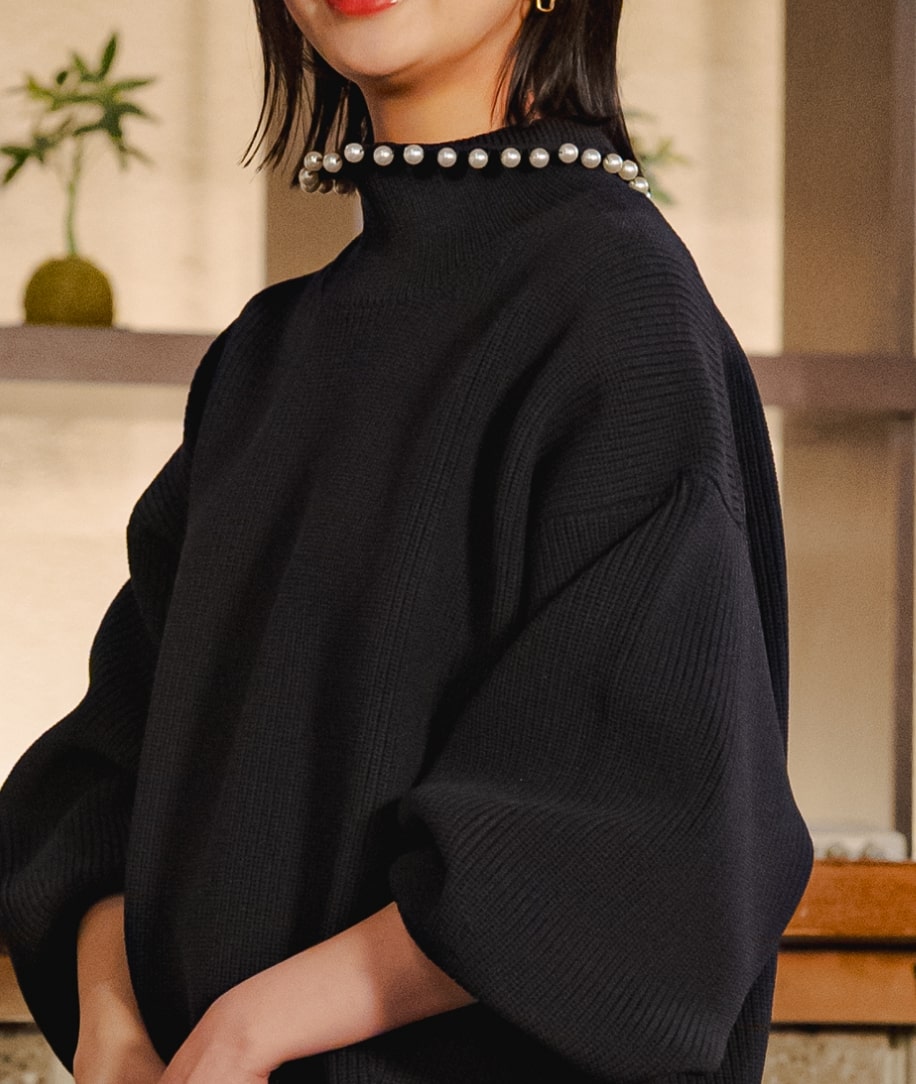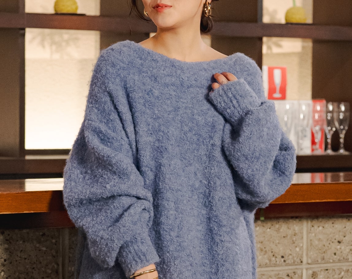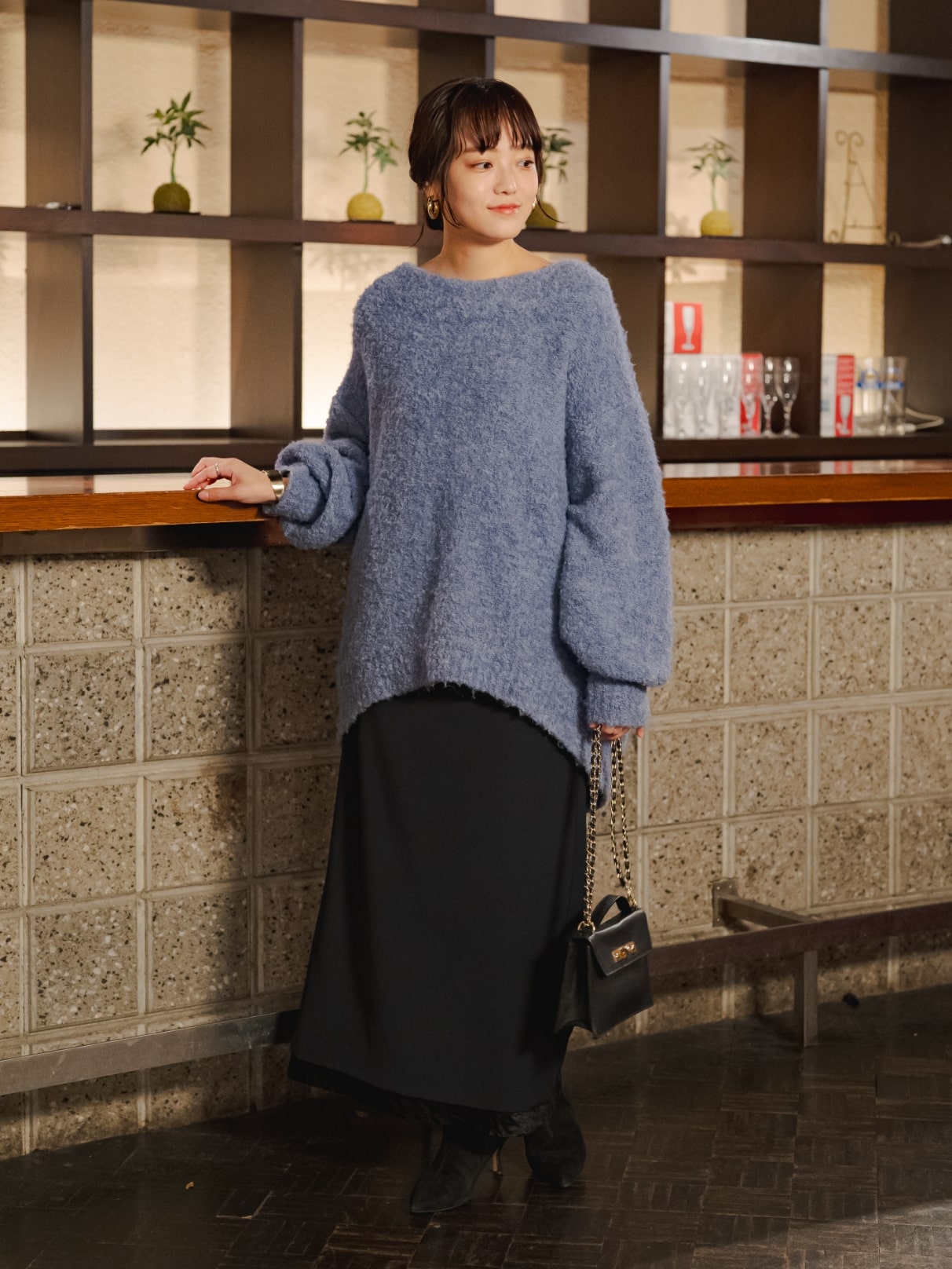 ウォーム感のあるブークレー素材のニットは、ニュアンスのあるブルーで決めすぎない華やかスタイルに。ニットのルーズなシルエットには、相性の良いタイトスカート合わせでベストバランスな着こなしがおすすめ。存在感のあるアクセと艶のあるスカートでラグジュアリー感をプラスしました。
