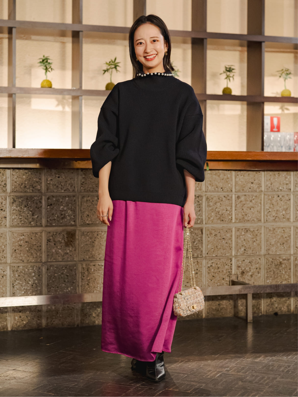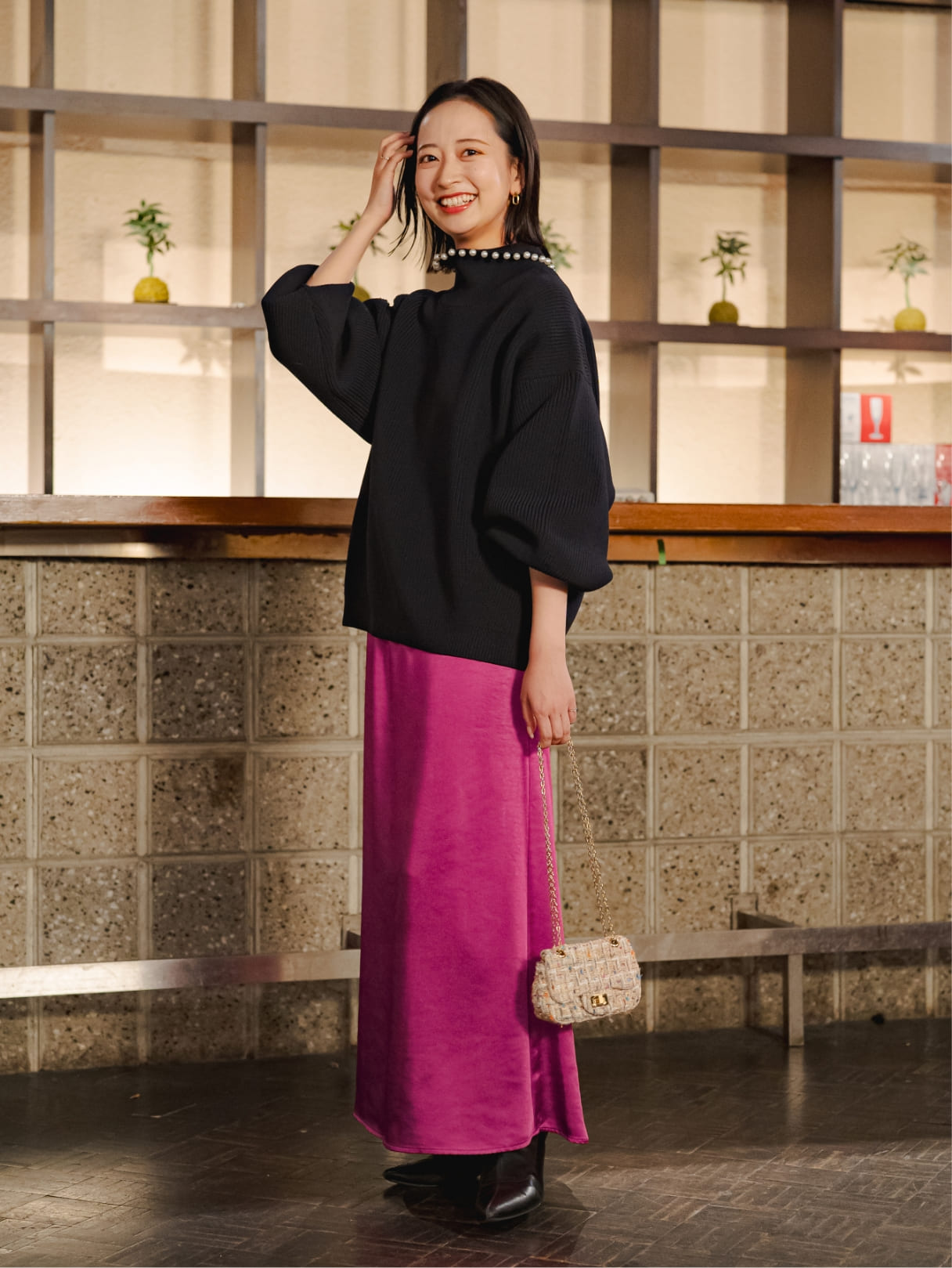 光沢感のあるスカートに、パールをあしらったニットは上品で女性らしい印象に。ややゆとりのあるニットのシルエットが畏まりすぎず、オフィスカジュアルスタイルにおすすめ。たくさんの人が集まるシーンにピッタリのコーディネートです。