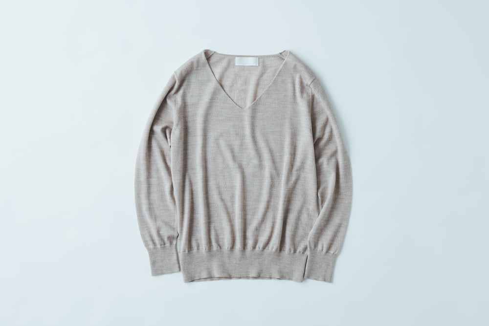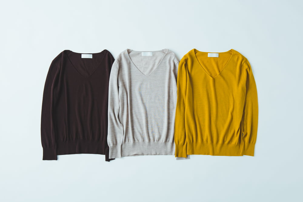 こだわりのイタリア糸を使用したハイゲージのベーシックなVネックニット。紡績段階から毛羽立ちを少なくした強撚の糸は、光沢感とハリのある上品な編地に仕上がります。毛玉になりにくく、カットソーのように薄手で柔らかな質感のニットです。