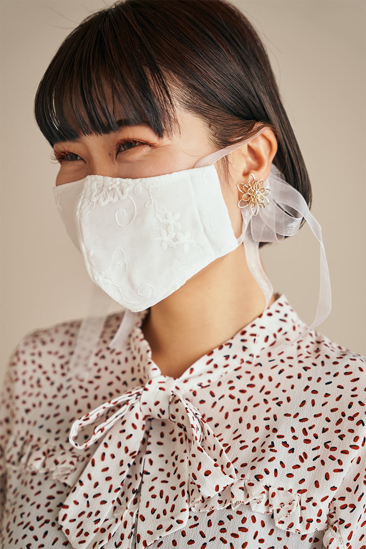 レースマスクは刺繍がポイント!リボンタイプなので結び方でアレンジが可能です。ゴールドのイヤリングと合わせて耳元のおしゃれをアピールできます。