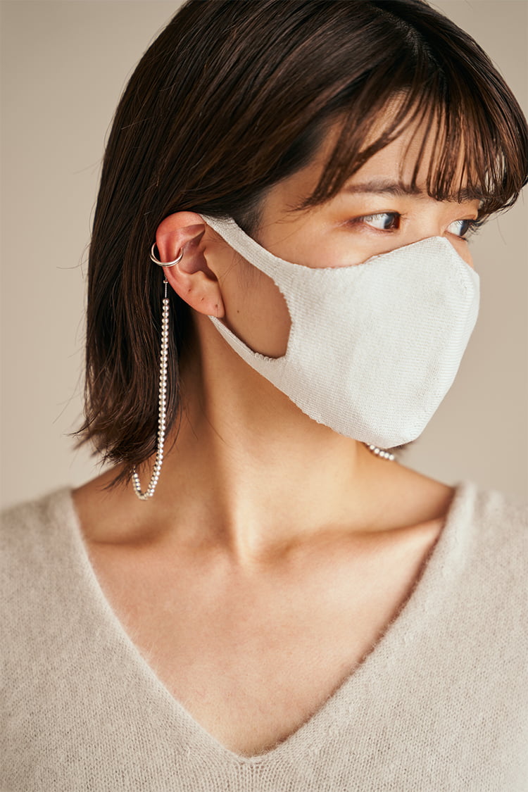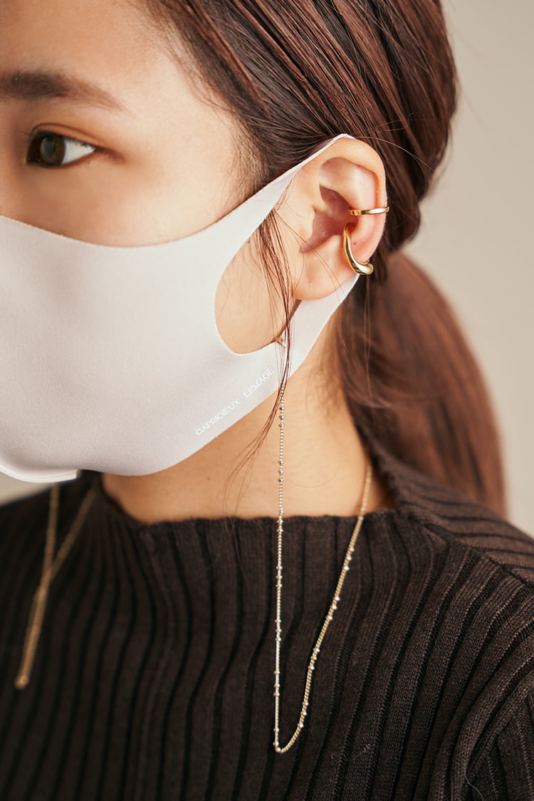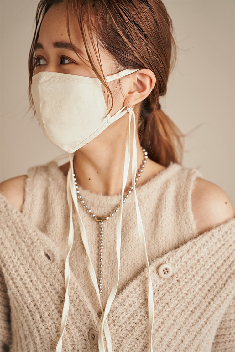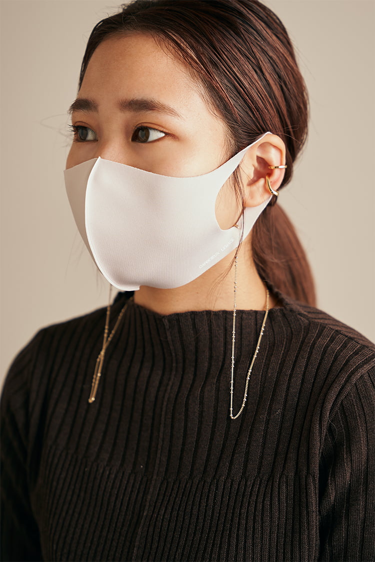 パイピングがポイントになったマスクに、華奢なチェーンが際立つようシンプルなスタイリングでまとめました。馴染みやすいベージュトーンのマスクなので、どんなカラーのコーデにも合わせて頂けます。一般的なマスクより、女性にあったやや小ぶりな作りなので小顔効果も◎ノーアクセでも華やかな印象に◎