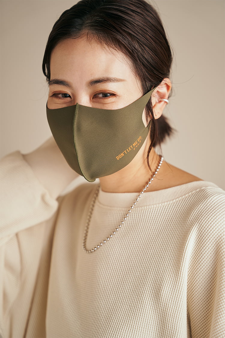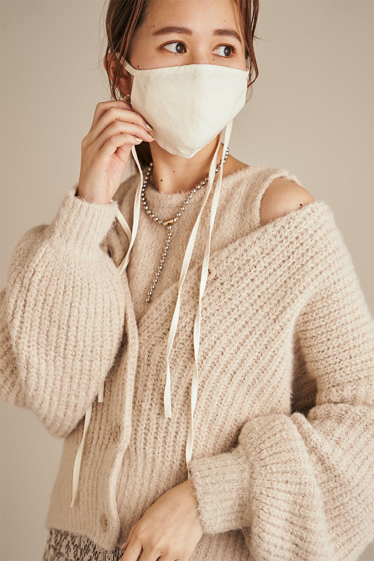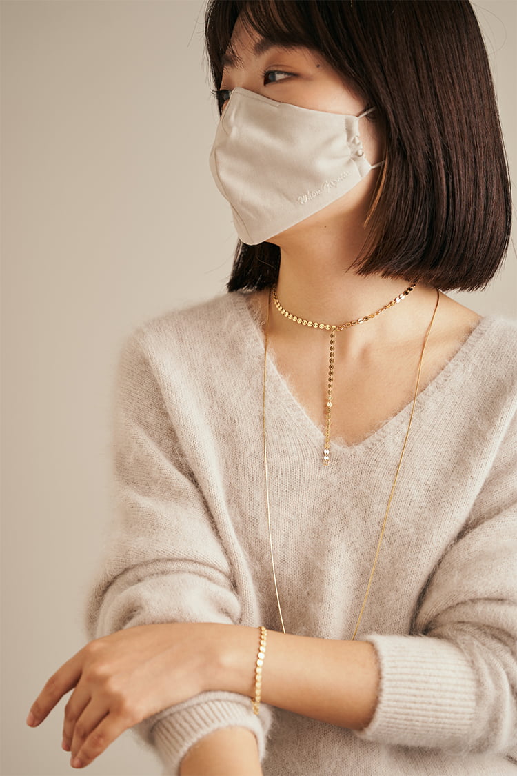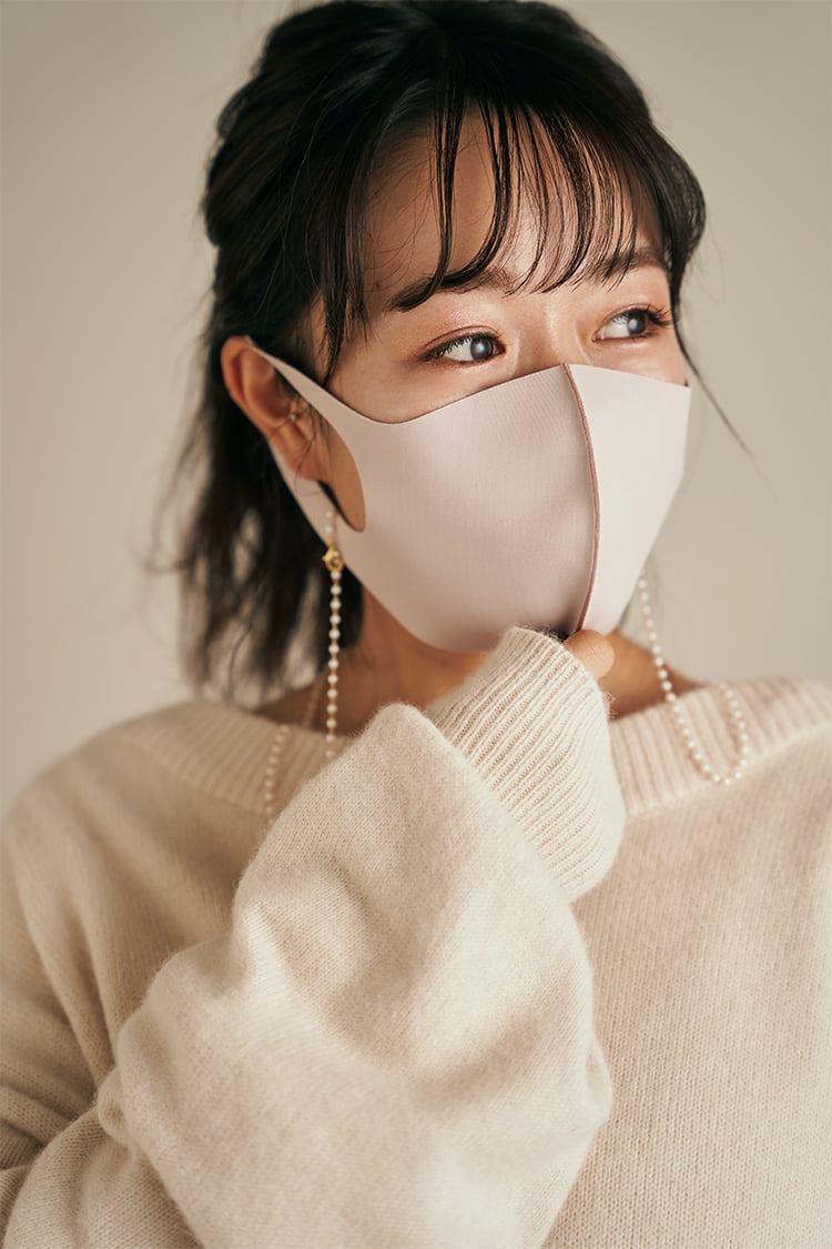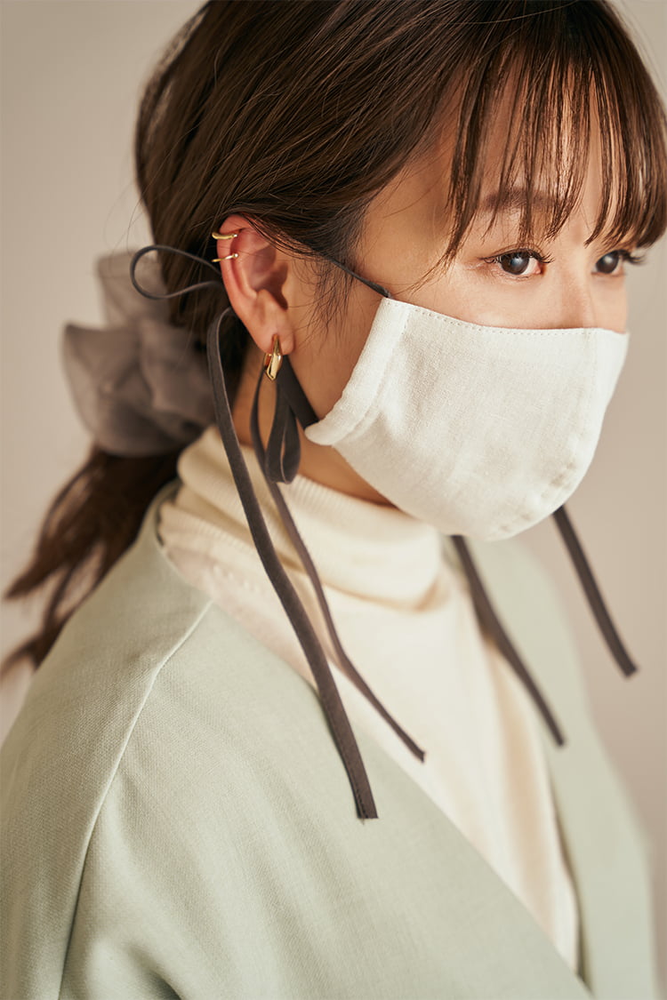 パイピングがポイントになったマスクに、華奢なチェーンが際立つようシンプルなスタイリングでまとめました。馴染みやすいベージュトーンのマスクなので、どんなカラーのコーデにも合わせて頂けます。一般的なマスクより、女性にあったやや小ぶりな作りなので小顔効果も◎ノーアクセでも華やかな印象に◎