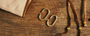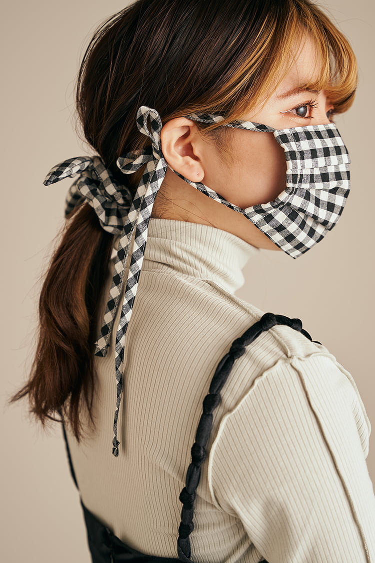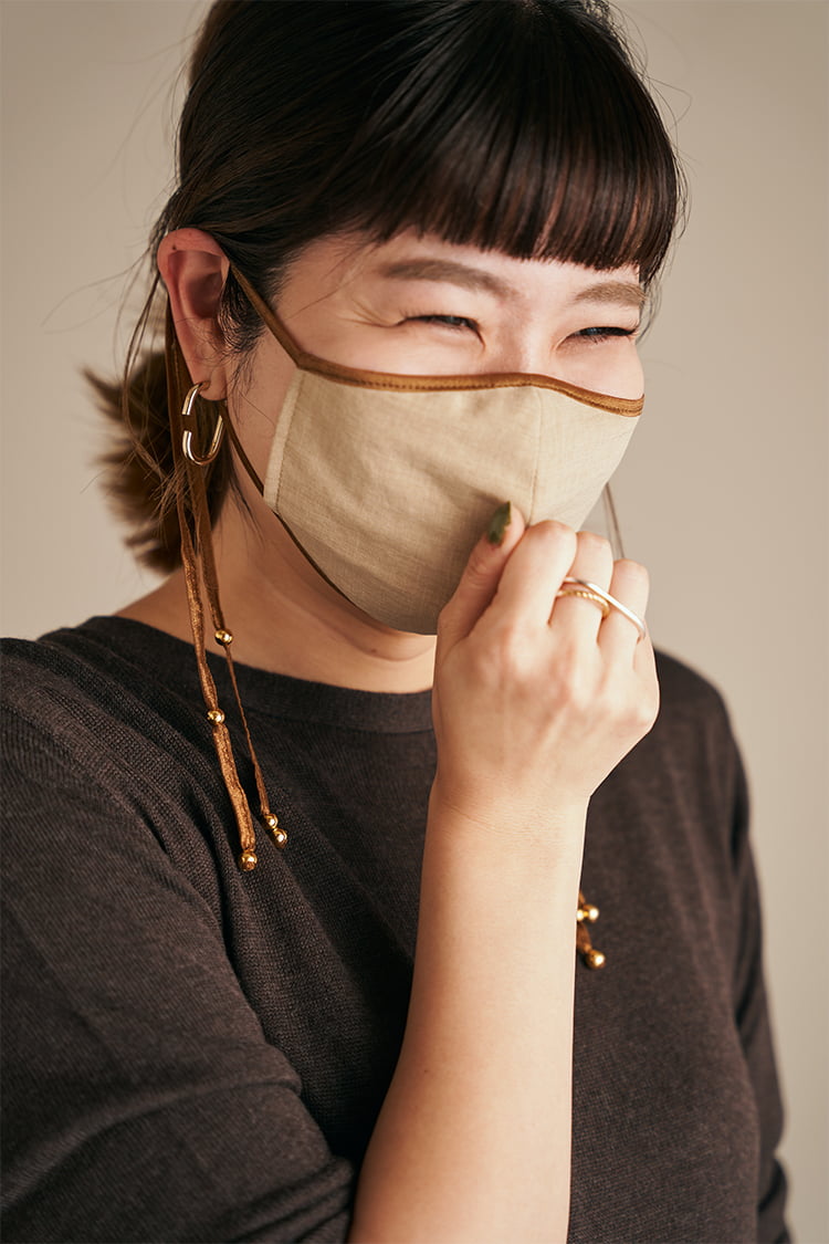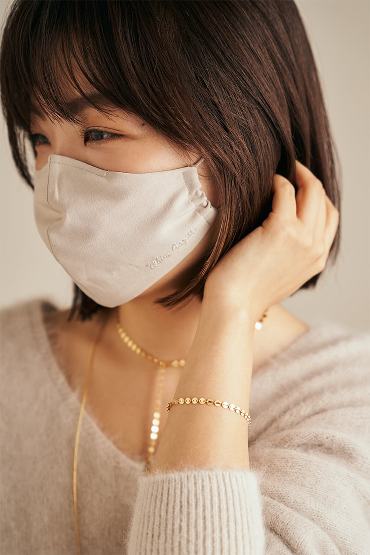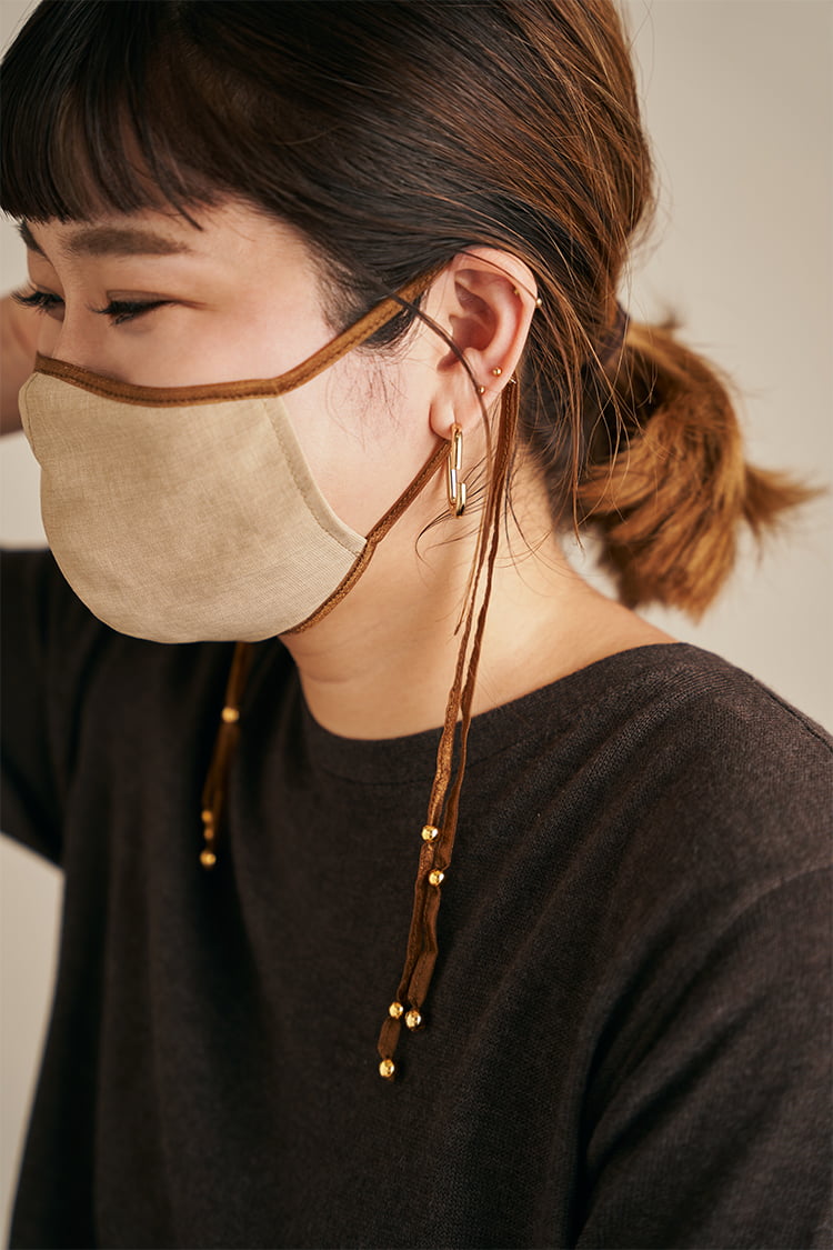パピヨネオリジナルのベージュのマスクに合わせ、アクセサリーはゴールドをセレクト。リボンのパイピングとゴールドのボールがポイントのマスクはアクセサリー感覚でつけられるパピヨネ一押しアイテムです。