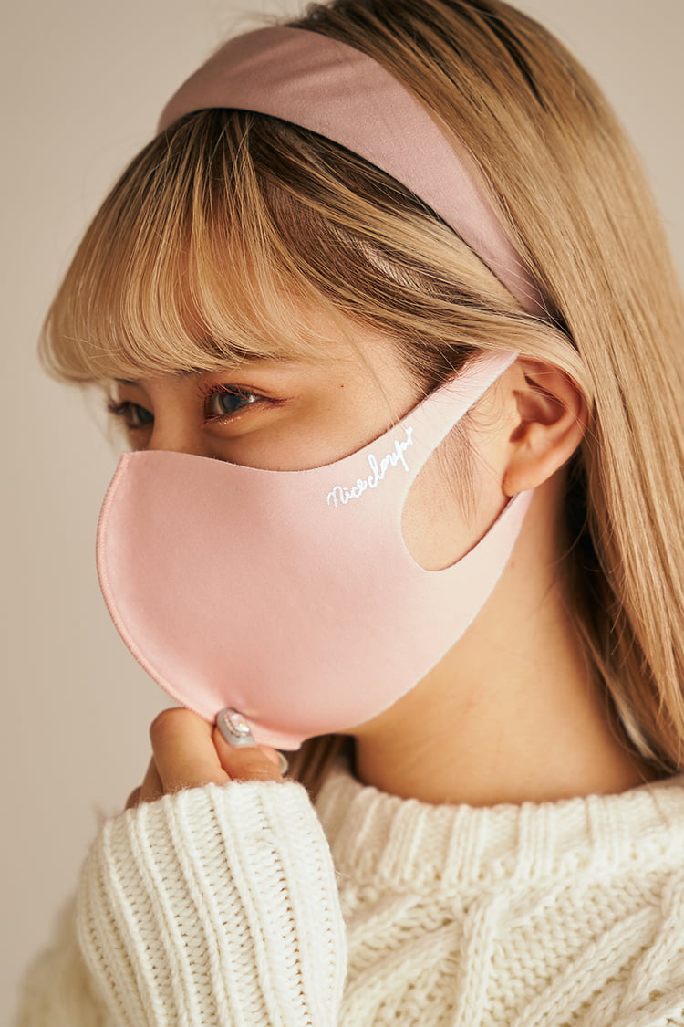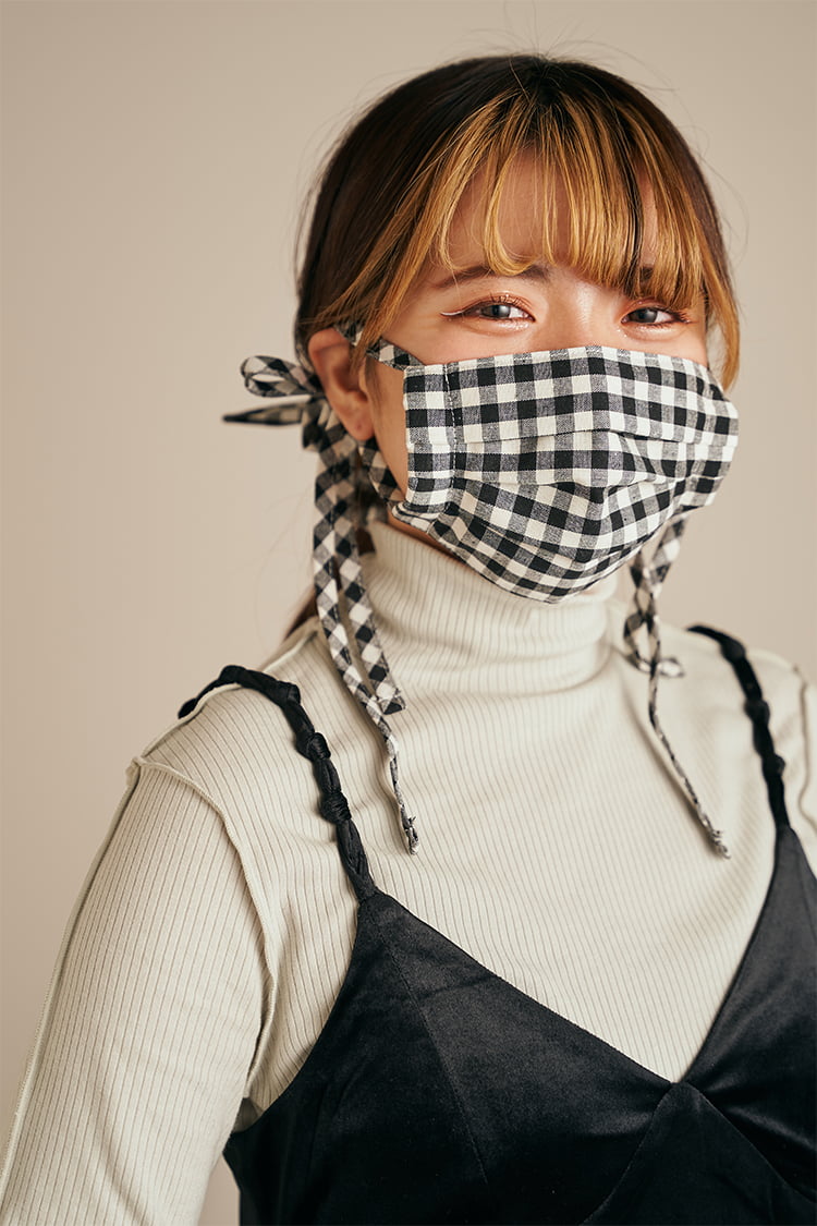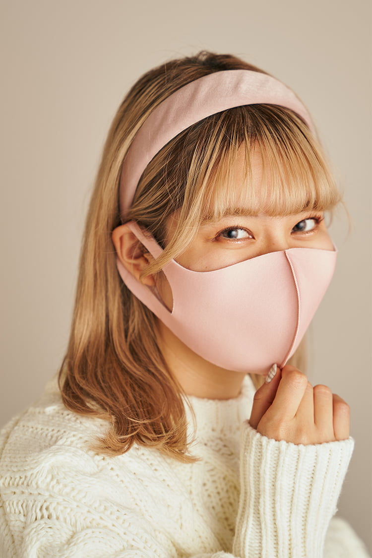 ナイスクラップらしいカラーのオレンジのマスクを引き立てるために、ベーシックなカラーのカチューシャを合わせました。