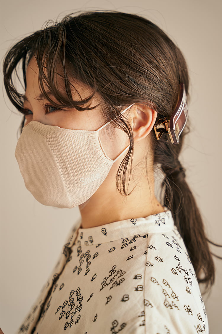 - 01 : ポケット式のホールガーメントマスクで立体編みが顔のカーブに自然とフィット