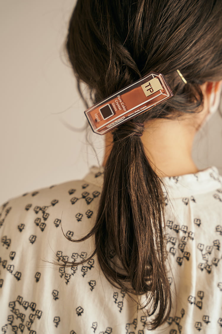 - 02 : 耳元のリボンデザインがスタイリングのポイントに