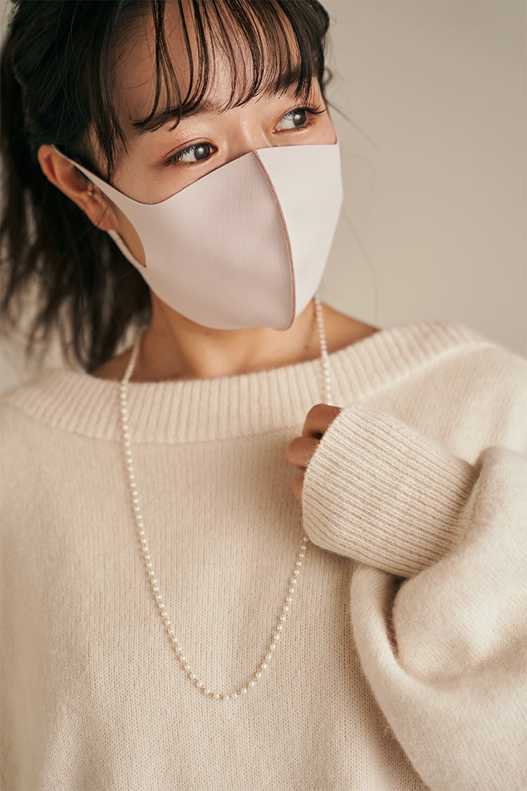 毎日つけるものだから、ファッションの一部になるような気分あがるアイテムをー。肌馴染みの良いベースカラーマスクと、煌めくパールビーズの華奢なストラップがポイント。ウィズコロナの新時代に欠かせなくなったマスク。細部までこだわり、アクセサリー感覚でお使いいただけます!