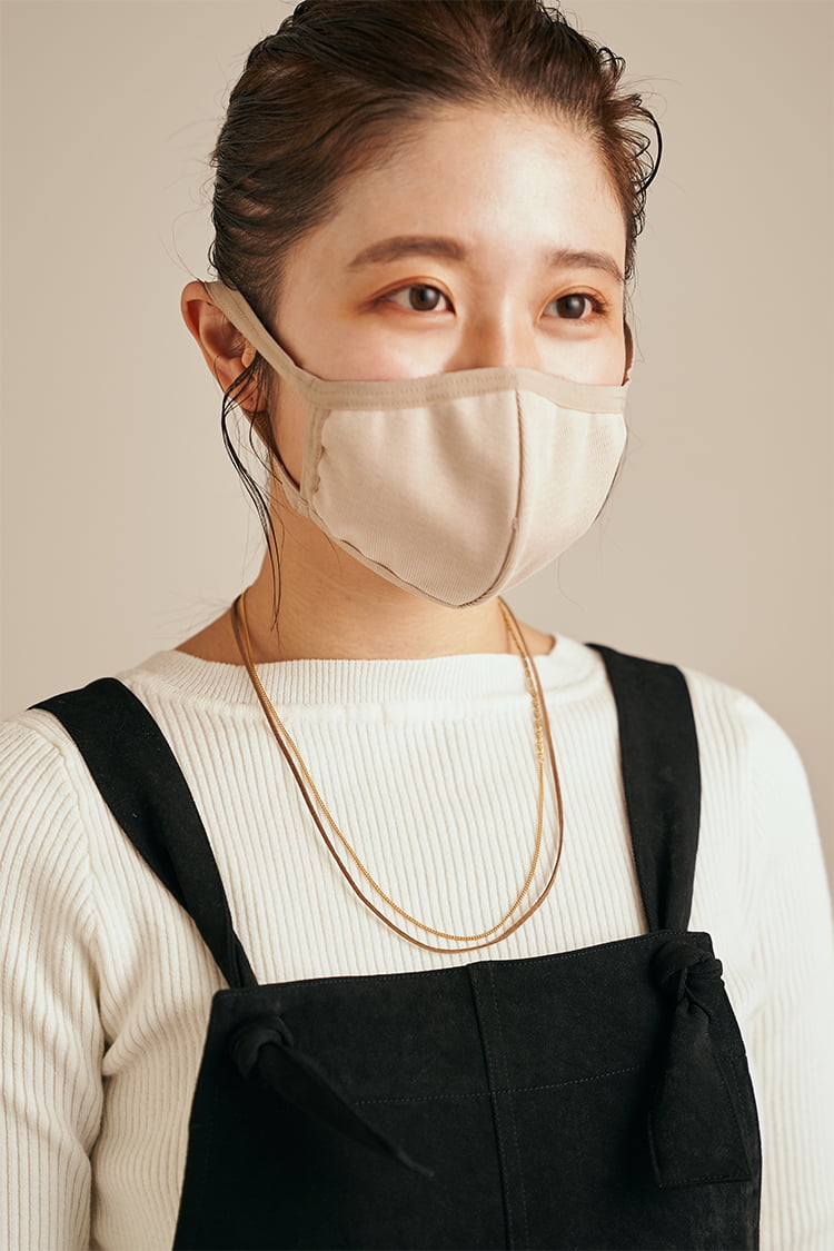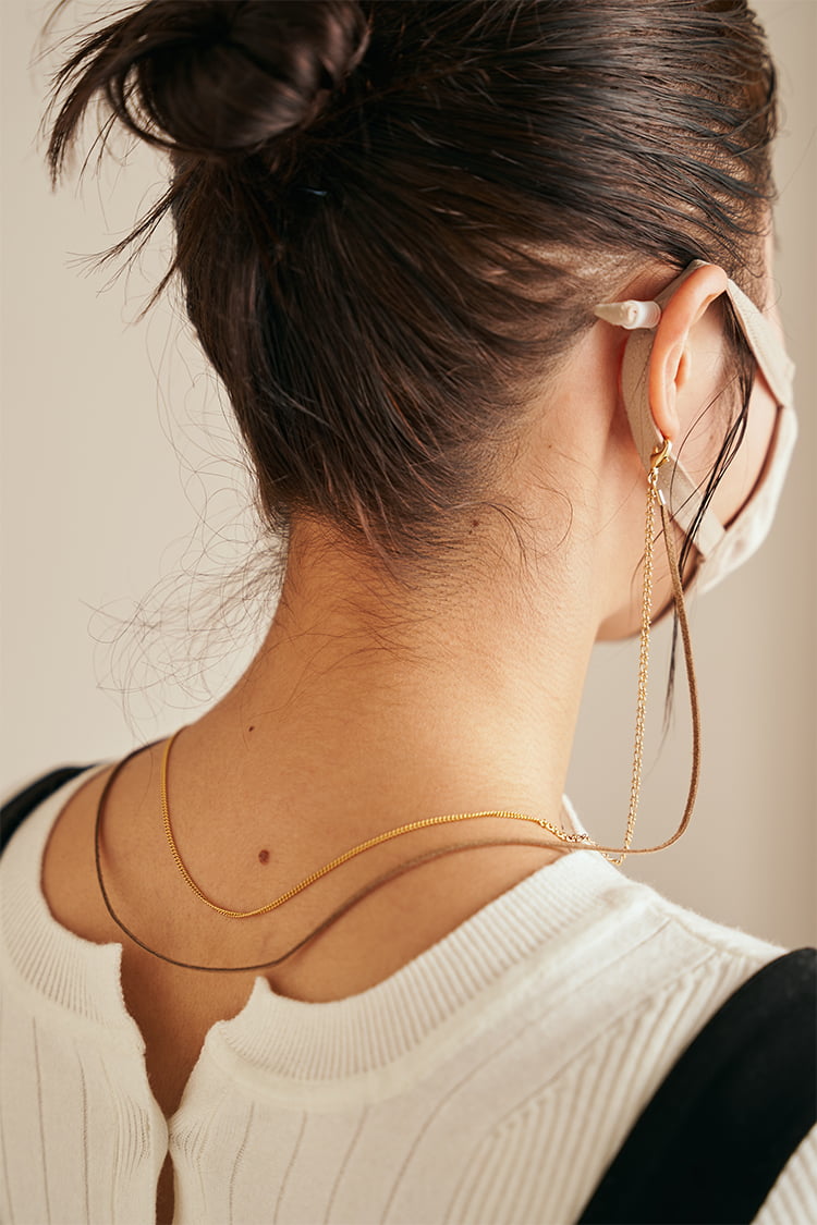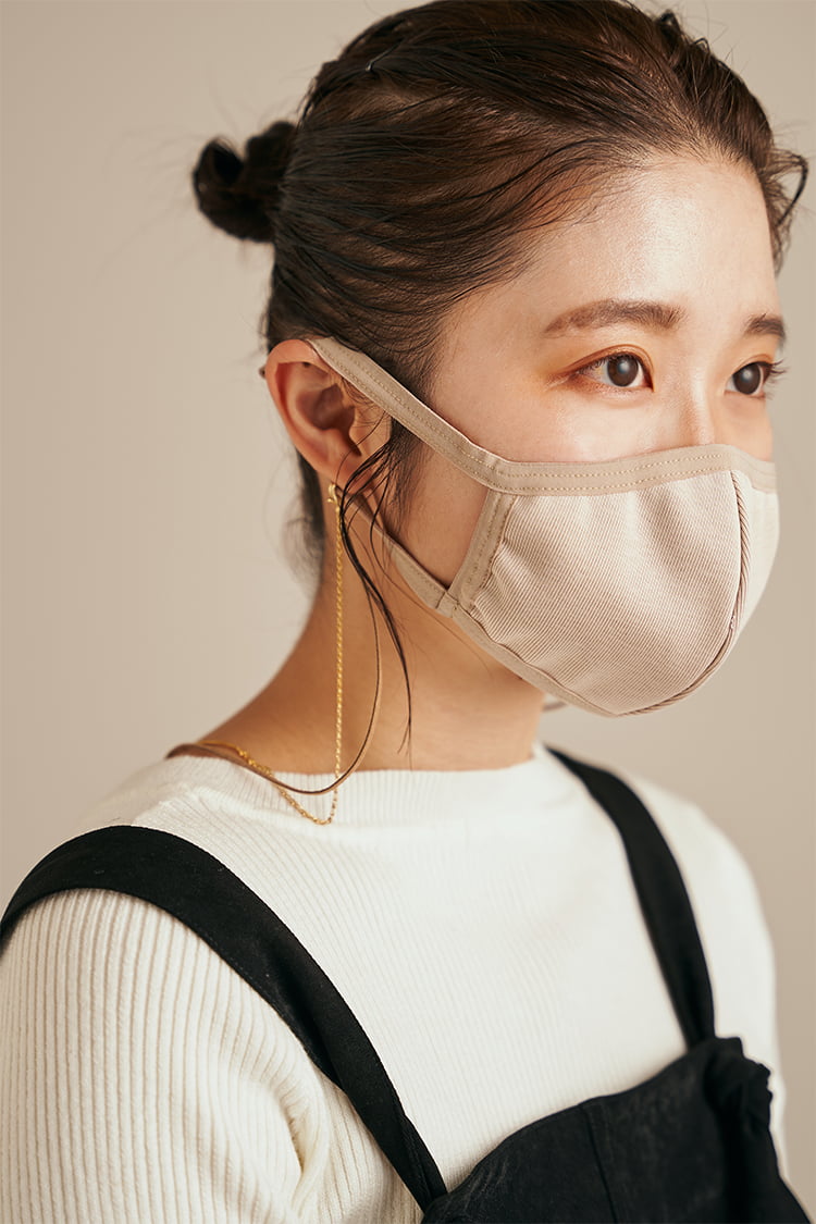 マスクをしていてもオトナカワイイ!をテーマに、大人気のベージュのマスク、ゴールドのアクセサリーとマスクチェーンでまとめました。お肌をトーンアップしてくれるベージュと、アクセサリーとの相性が良いマスクチェーンがポイントです。