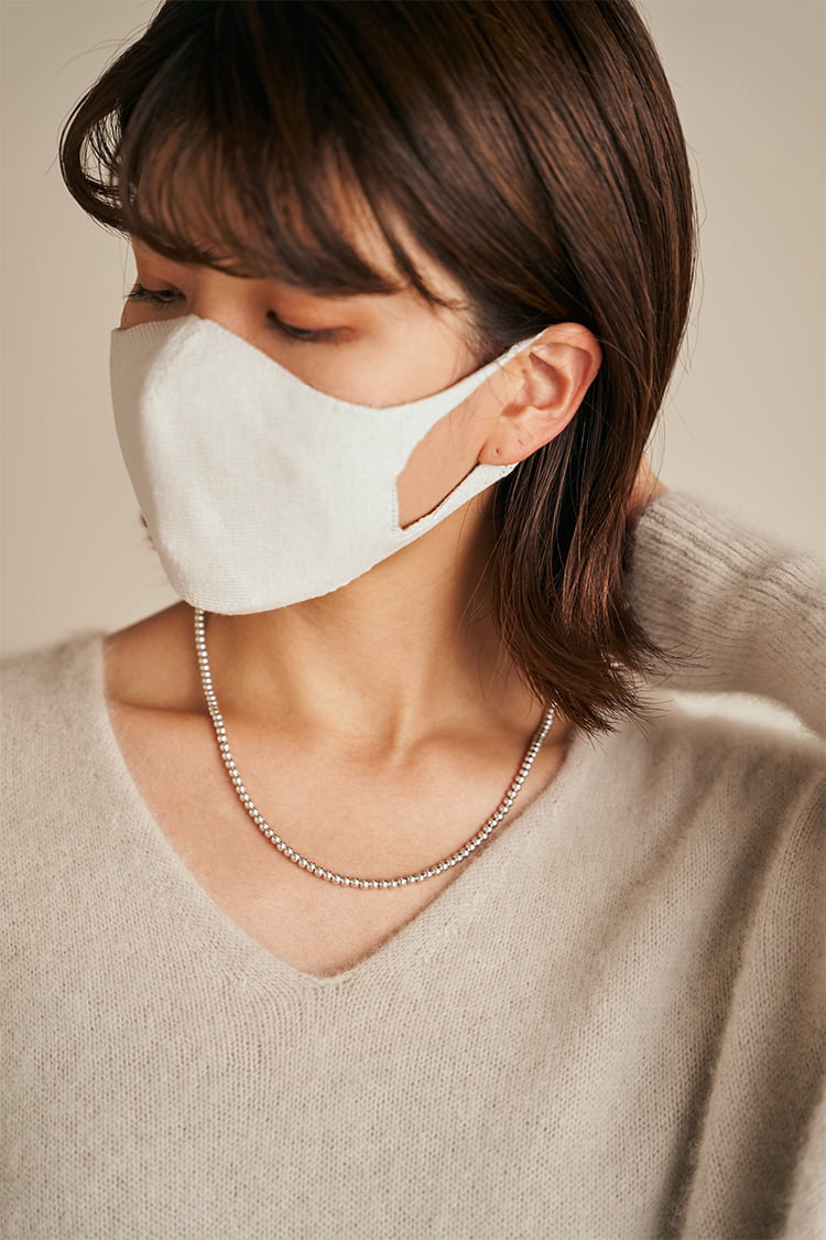 すっきりとした印象の立体型マスクなので、存在感のあるボールチェーンネックレスもバランス良く◎シルバーのアクセサリーでまとめれば大人な印象に仕上がります。