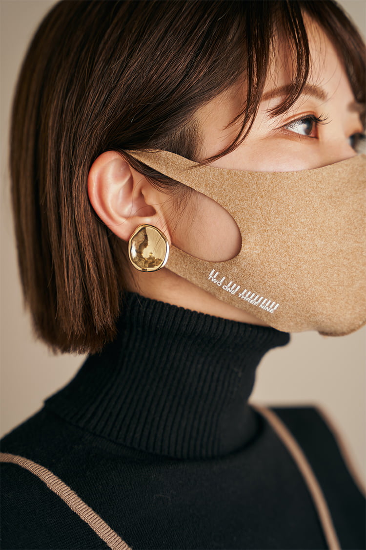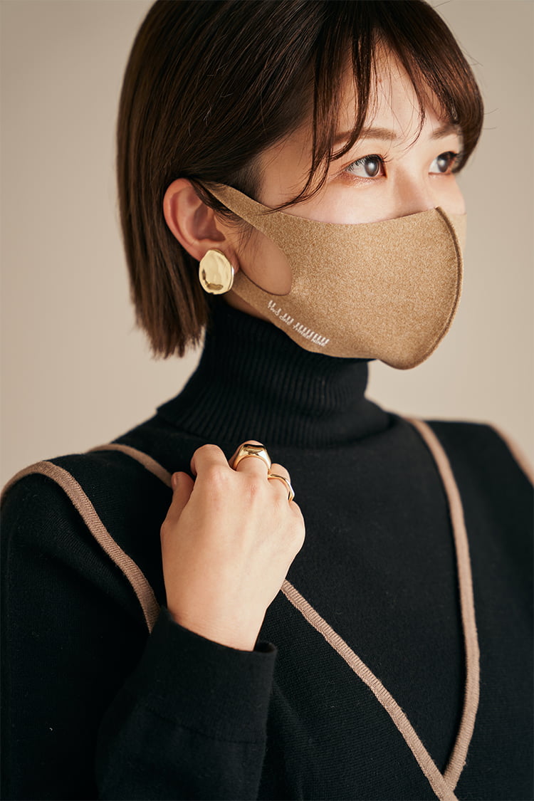 肌なじみのいいカラーであるベージュのマスクと、ゴールド系のアクセサリーでまとめました。マスクは、暖かみのある素材なのでこれからの時期の冬のコーディネートにもマッチします。ダークトーンのコーディネートにプラスすることでより華やかな印象に。