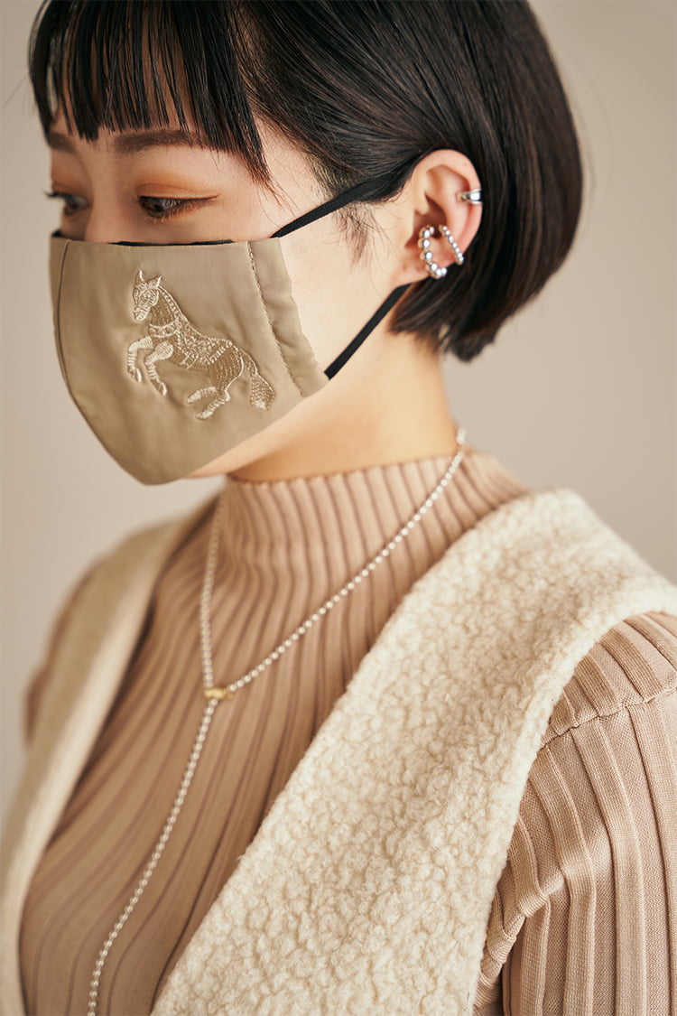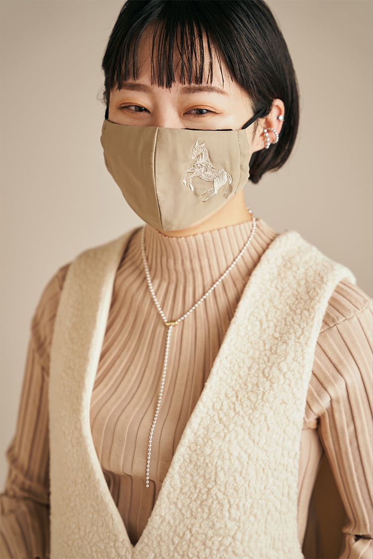 - 01 : 肌なじみのよいグレージュのカラーに共色の馬刺繍が上品な印象のマスク