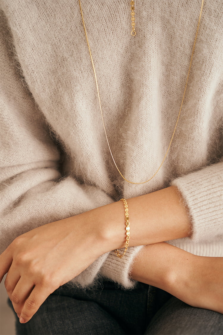 ウィム ガゼットこだわりの上品なトーンのベージュは、トレンドのゴールドアクセを重ね付けしてもコーディネートに馴染んでくれる優れものです。