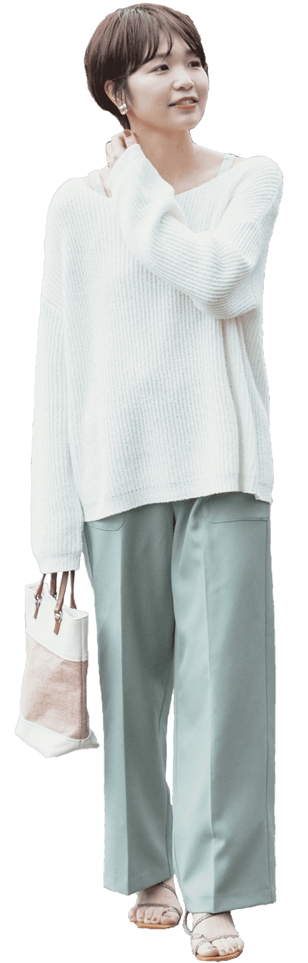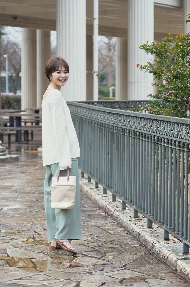 ゆるっとしたシルエットが新鮮なリブニット。 大きめのパッチポケットがポイントのワイドパンツが、程よくカジュアルダウンさせてくれます。小物はトレンドのパイソン柄のトングサンダルやラフィア素材のバッグを合わせました。