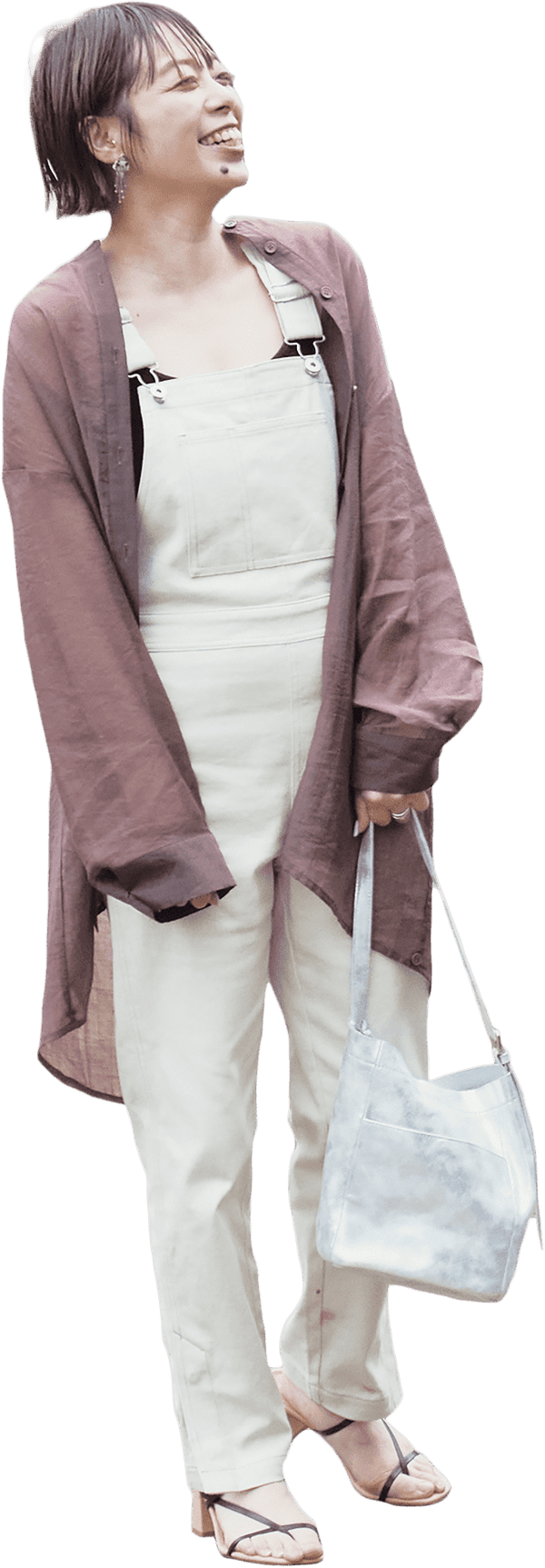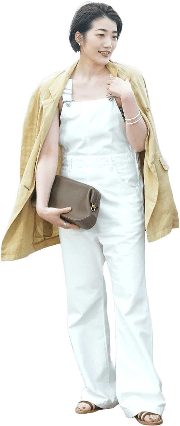 オールインワンにリネンジャケットを合わせた、大人見えのコーディネートです。艶感のあるバッグを取り入れ、カジュアルになりすぎないバランスにしました。レオパード柄の水着をチラ見せした、個性と遊び心のあるウィムガゼットらしいスタイルです。小さめピアスで華やかさを、足元のサンダルで抜け感をプラス。オールインワンの肩紐を片側だけ垂らしたり、ジャケットを腰巻きしたアレンジもオススメです。