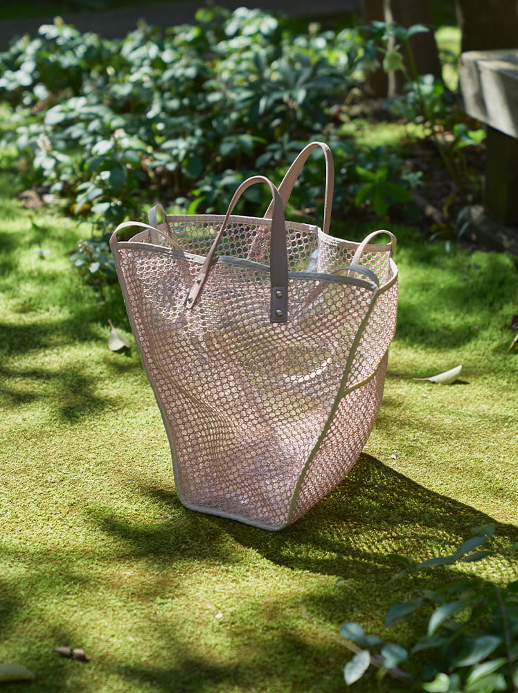 シリコン素材のクリアバッグをベースに網目のデザインを組み合わせた「メッシュバッグ」は、スタイリングにプラスするだけで季節感が出るアイテムです。荷物量もしっかり入るサイズで、普段使いにはもちろんレジャーシーズンにも活躍すること間違いなし。