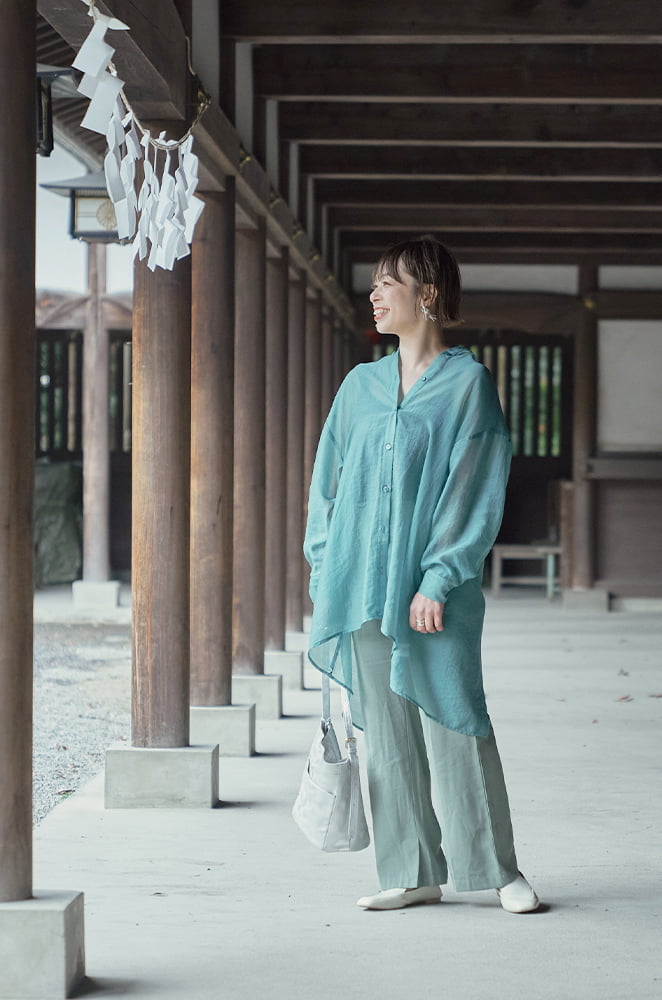様々なアレンジが楽しめるマルチWAYシャツに、今シーズンもマストなフレアースラックスのコーディネートです。トレンドのシアー素材で仕立てた一枚で主役になるシャツチュニックは、バックスタイルもスリット仕様になったり、フロントは2段階でカシュクール仕様にもなるマルチWAY。夏にはノースリーブの上から羽織りとしても。