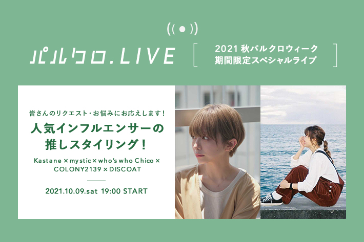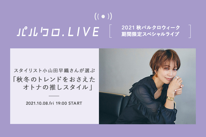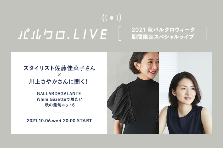 【2021 AUTUMN パルクロウィーク SPECIAL LIVE】人気スタイリスト佐藤佳菜子さんと川上さやかさんをゲストに、「GALLARDAGALANTE」と「Whim Gazette」の新作からセレクトいただいた秋の“いち推し”ニットを自らスタイリングしていただきます。上品で洗練された秋のスタイリングは必見! 是非ご覧ください。