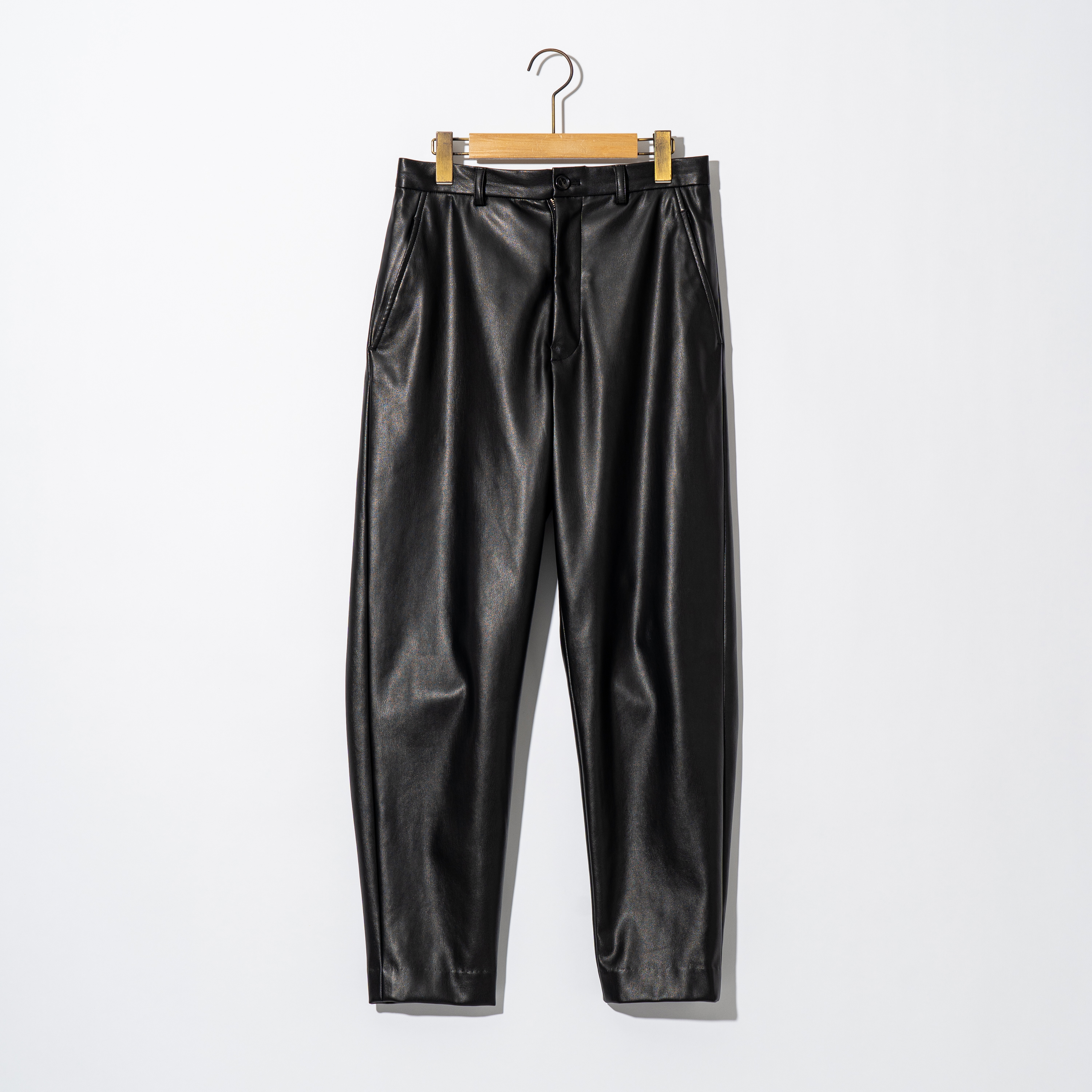 フェイクであることを疑ってしまう、まるでリアルレザーの様な質感、光沢感の湿式フェイクレザーを使用したパンツ。何にでも相性の良い優秀なシルエットがポイントで、普段のコーディネートに合わせるだけでアクセントになってくれるアイテムです。