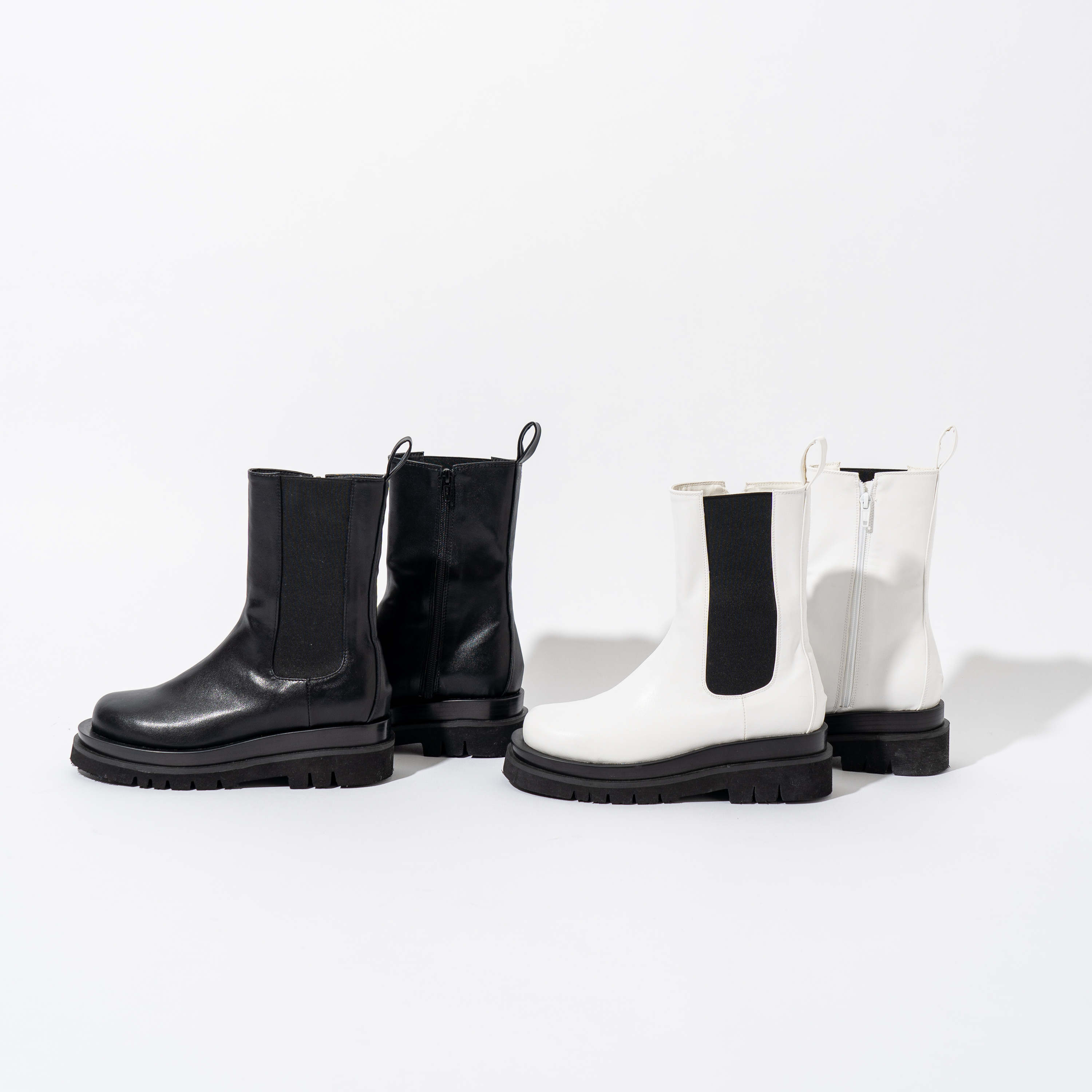 エコレザーで天候を気にせず、雨の日でも足元のおしゃれを楽しんでいただけるサイドゴアブーツ。履きまわしのきくシンプルなデザインなので合わせるボトムスを選ばず、幅広く合わせていただけます。