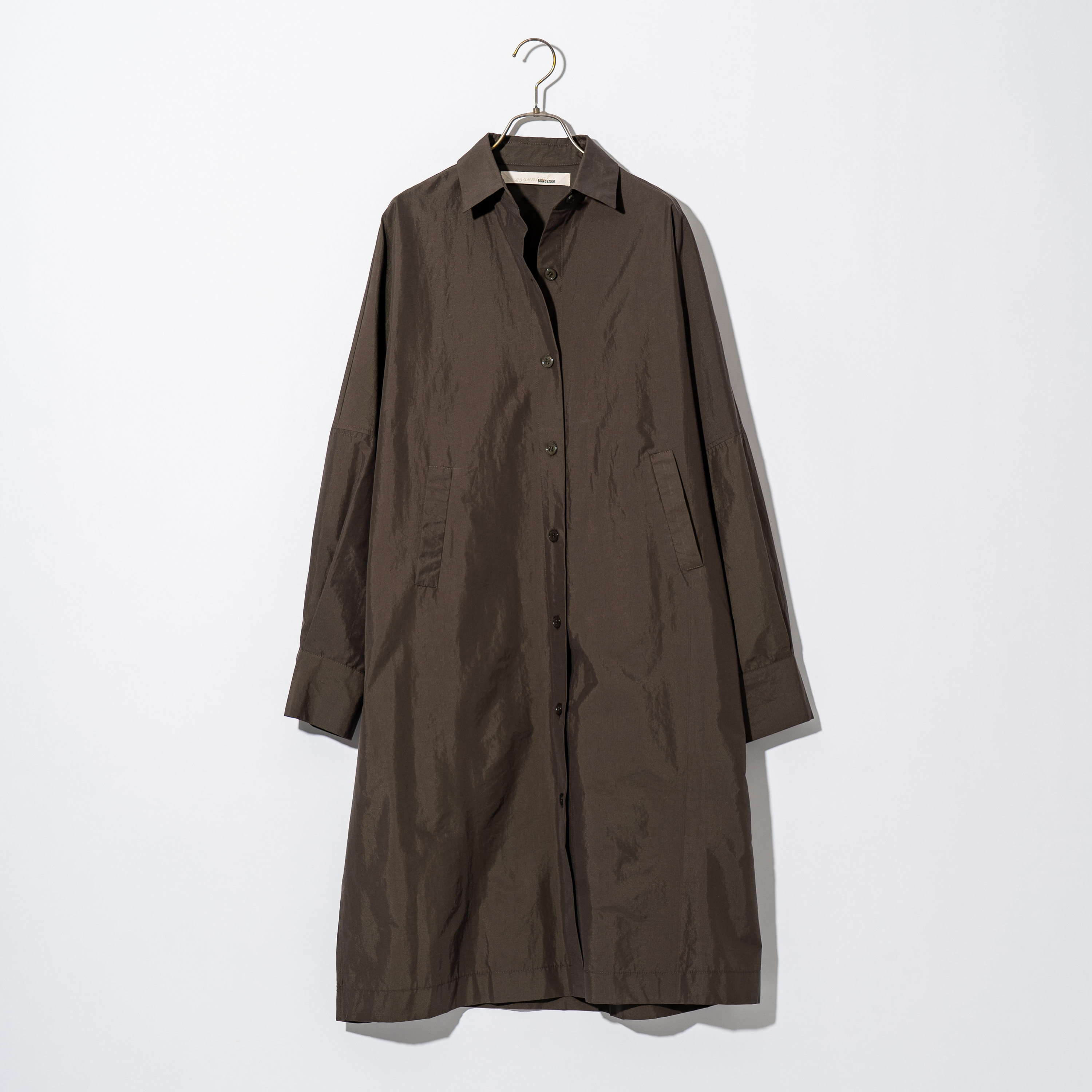 オーバーサイズサイドスリットナイロンコートのご紹介です。 フェミニンながら、どこかミリタリーテイストも感じられるナイロンコートです。 背中にグログランテープをあしらい、袖の長さの調整に使えるようにDカンを付けています。