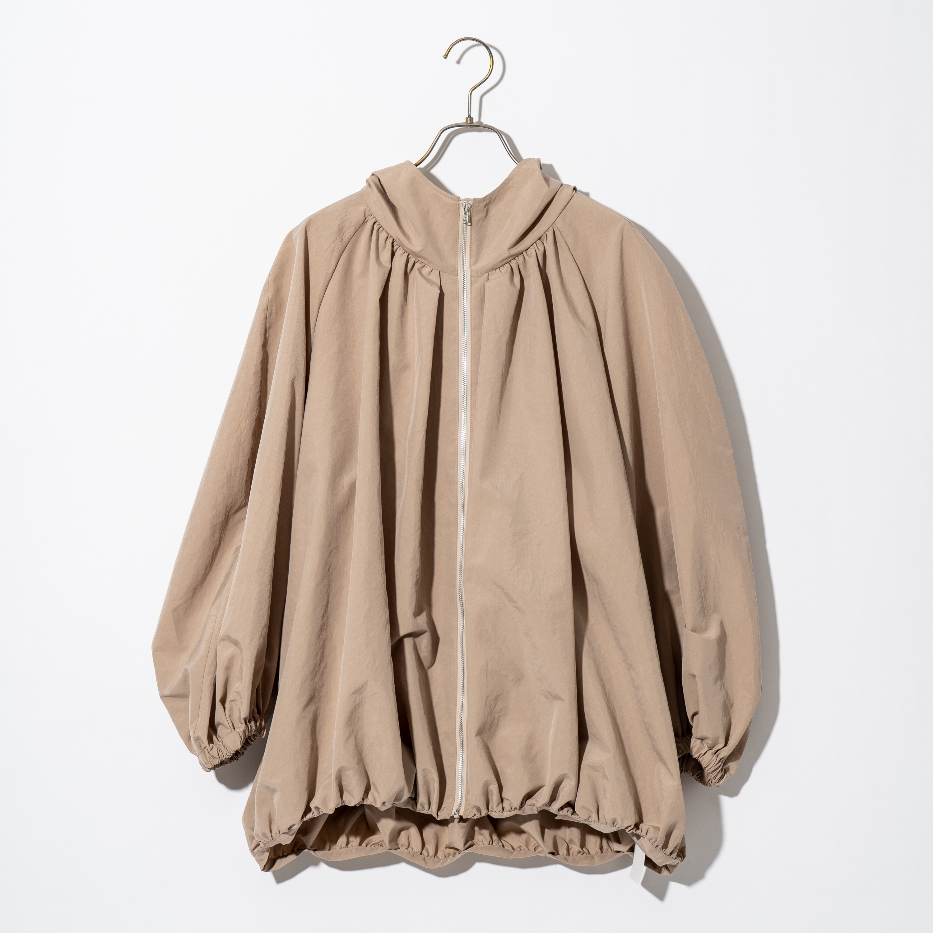 肩や袖が動かしやすい、ラグランスリーブ。襟ぐりから裾にかけてたっぷりと入ったギャザー。ややハリ感のある素材でころんとしたシルエットがキープされます。とても軽く、手洗い可能なポリエステル100%素材。
