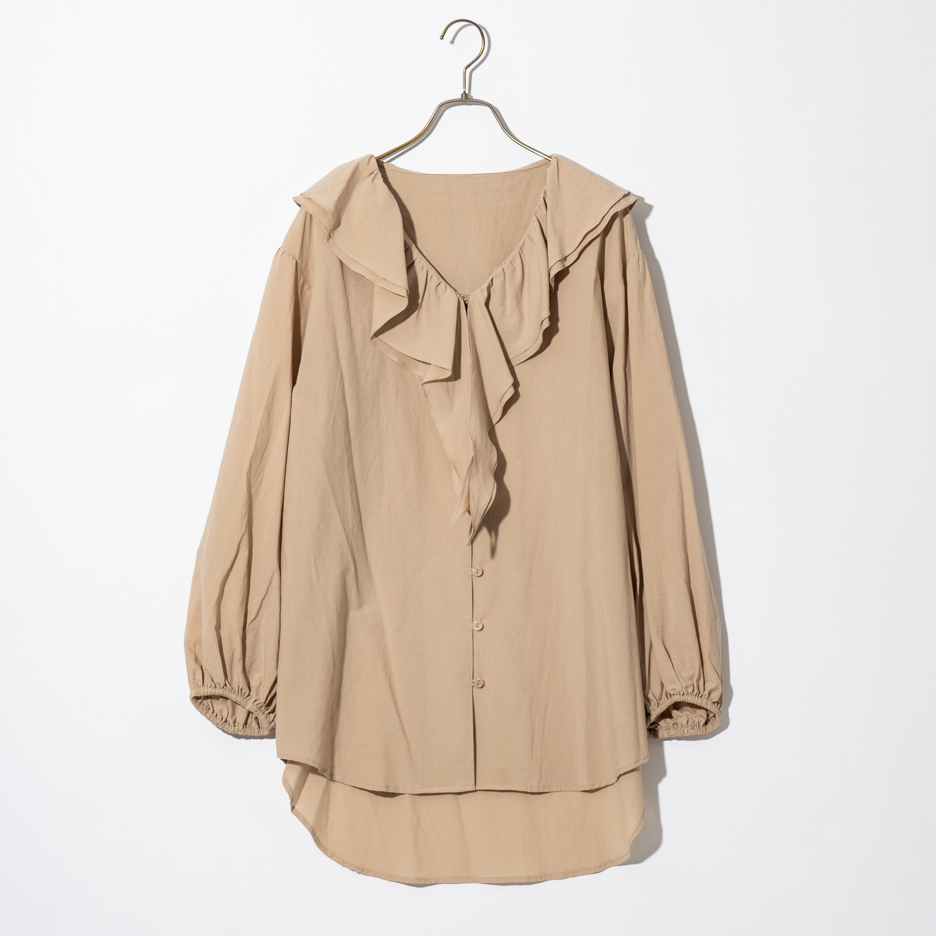 2枚重ねの大ぶりフリルが、ビンテージな雰囲気を漂わせるブラウス。コットン100%でさらりとした着心地なので、春~初夏まで大活躍してくれます。首元はVネックデザインで、お顔周りをすっきりと、そしてデコルテラインを綺麗に演出してくれます。