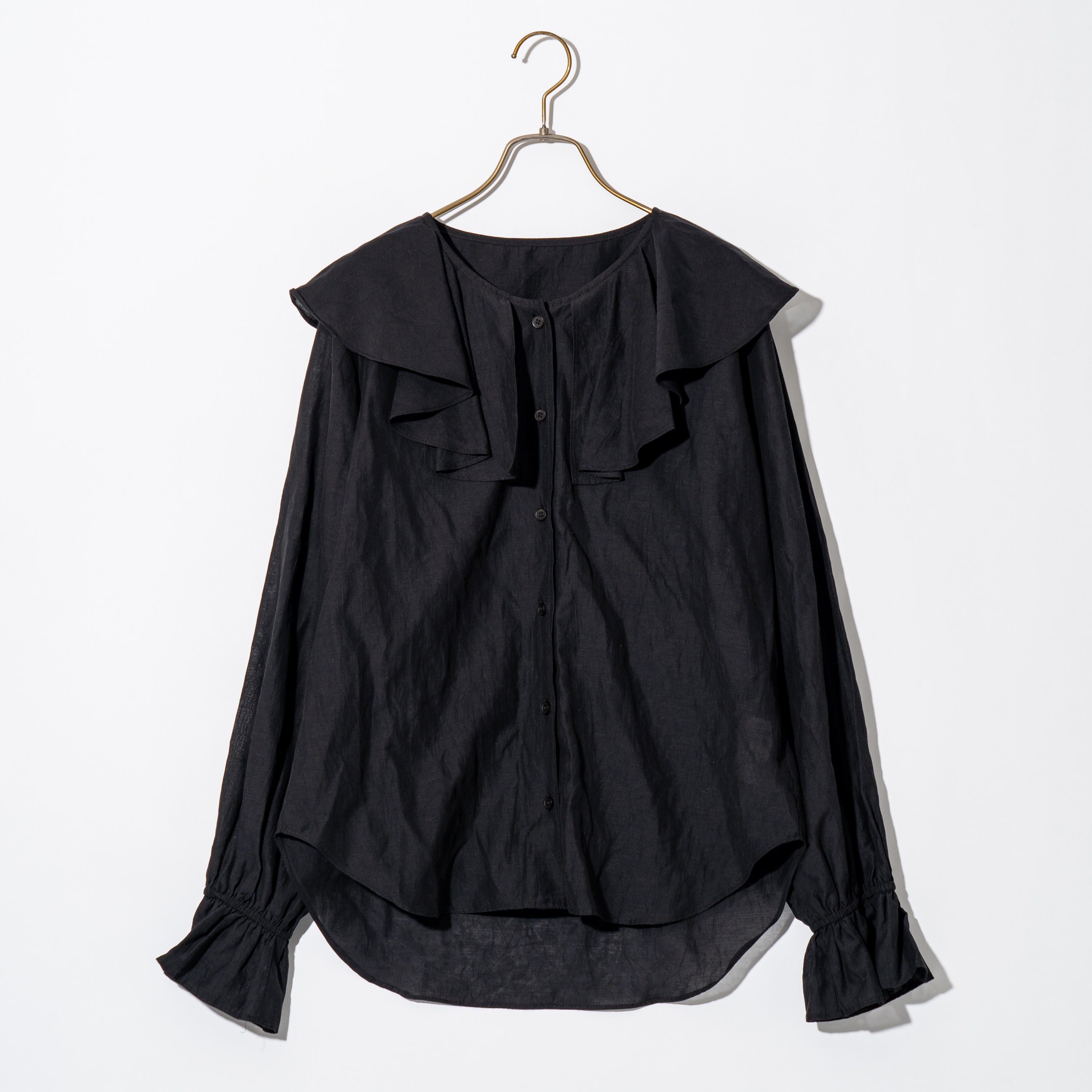 コットンリネンの風合いある素材感で、着心地良く大人な印象で着ていただける一枚。どの角度から見てもお洒落見えしてくれる上に、襟元のフリルやベルスリーブが顔まわりや腕をすっきりと見せてくれる優秀ブラウスです。