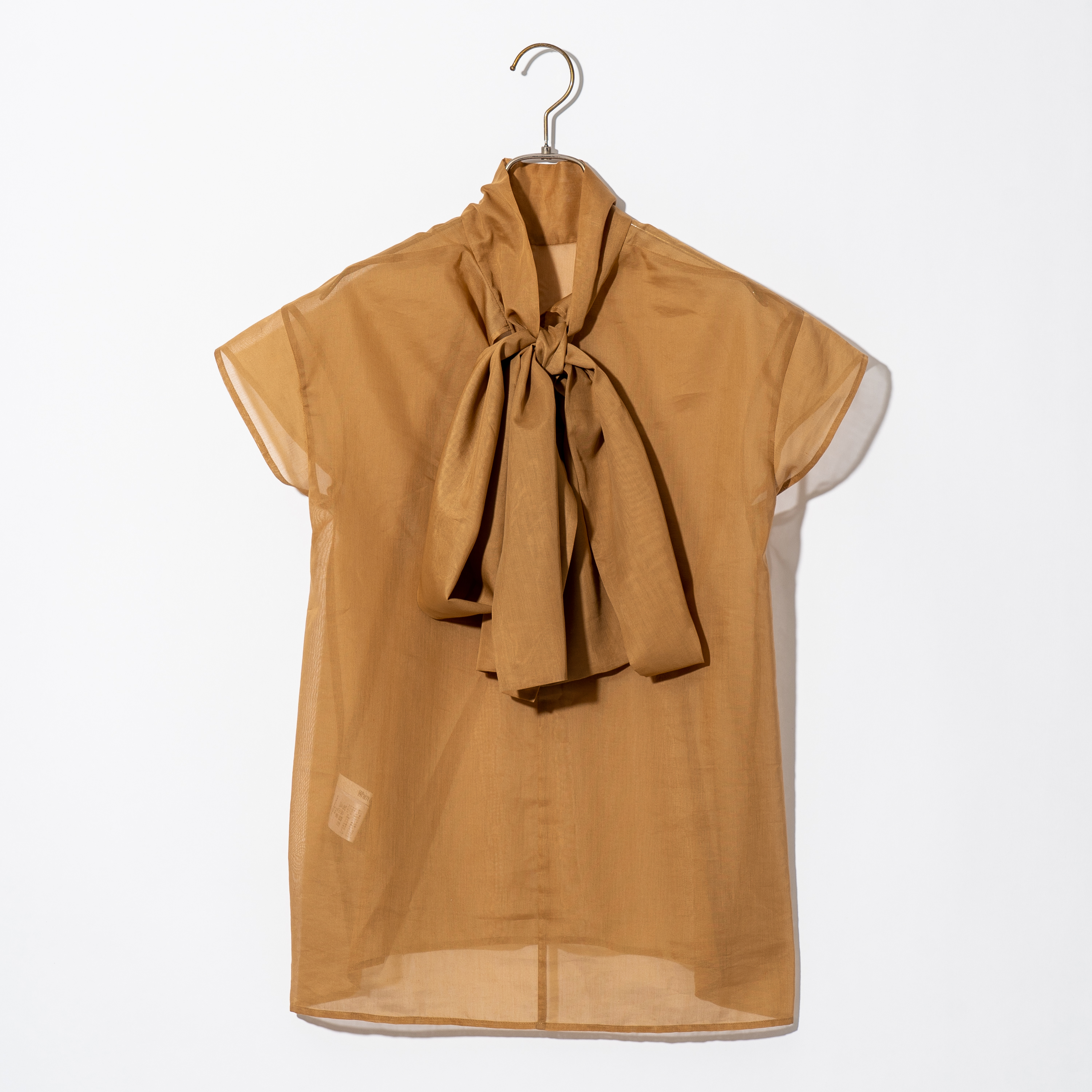 バックリボンが華やかな、シアー感のあるボータイブラウス。シャリ感と適度なハリのあるオーガンジー素材で、美しいシルエットのアイテムです。腕がすっきり見えるフレンチスリーブで、半袖のTシャツやニットのinに重ねてレイヤードするのもおすすめです。