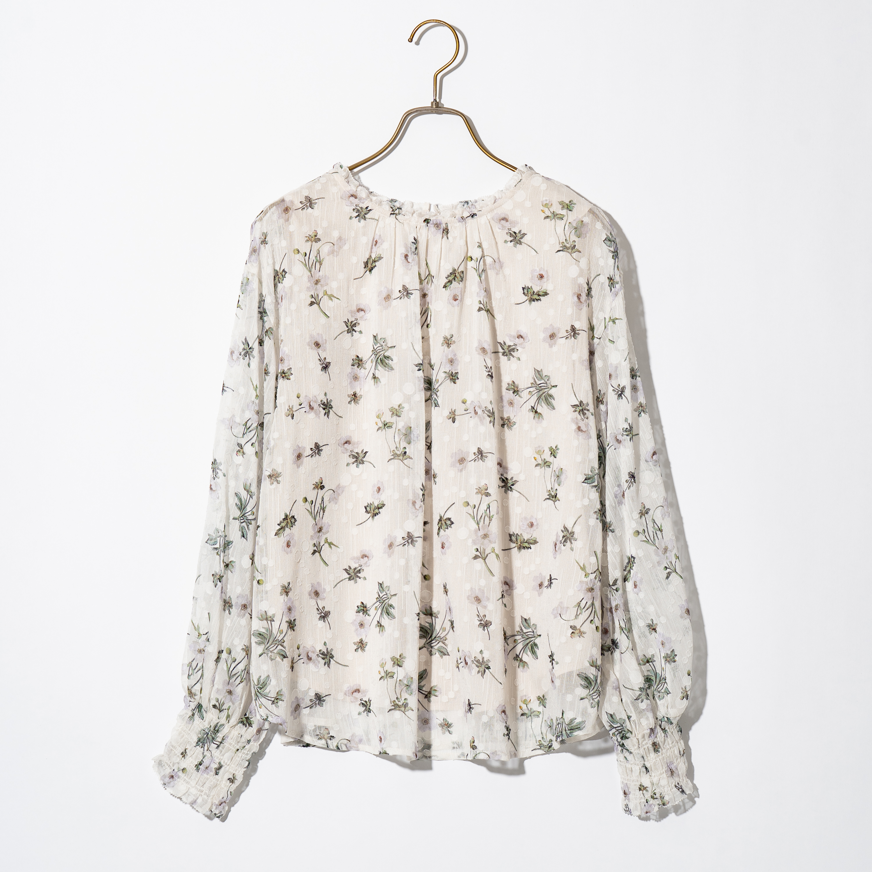 透かしドットのベース素材にフラワープリントが春らしい1枚。シアー感がありますが、身頃部分にインナーが付いているので透け感も気になりません。袖口ギャザーが着るだけでふんわりとボリューム感が出るのがポイント◎