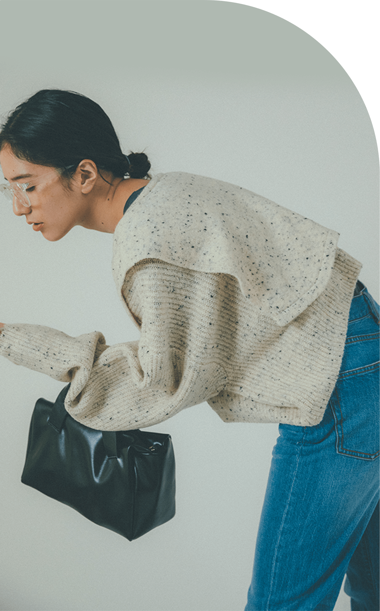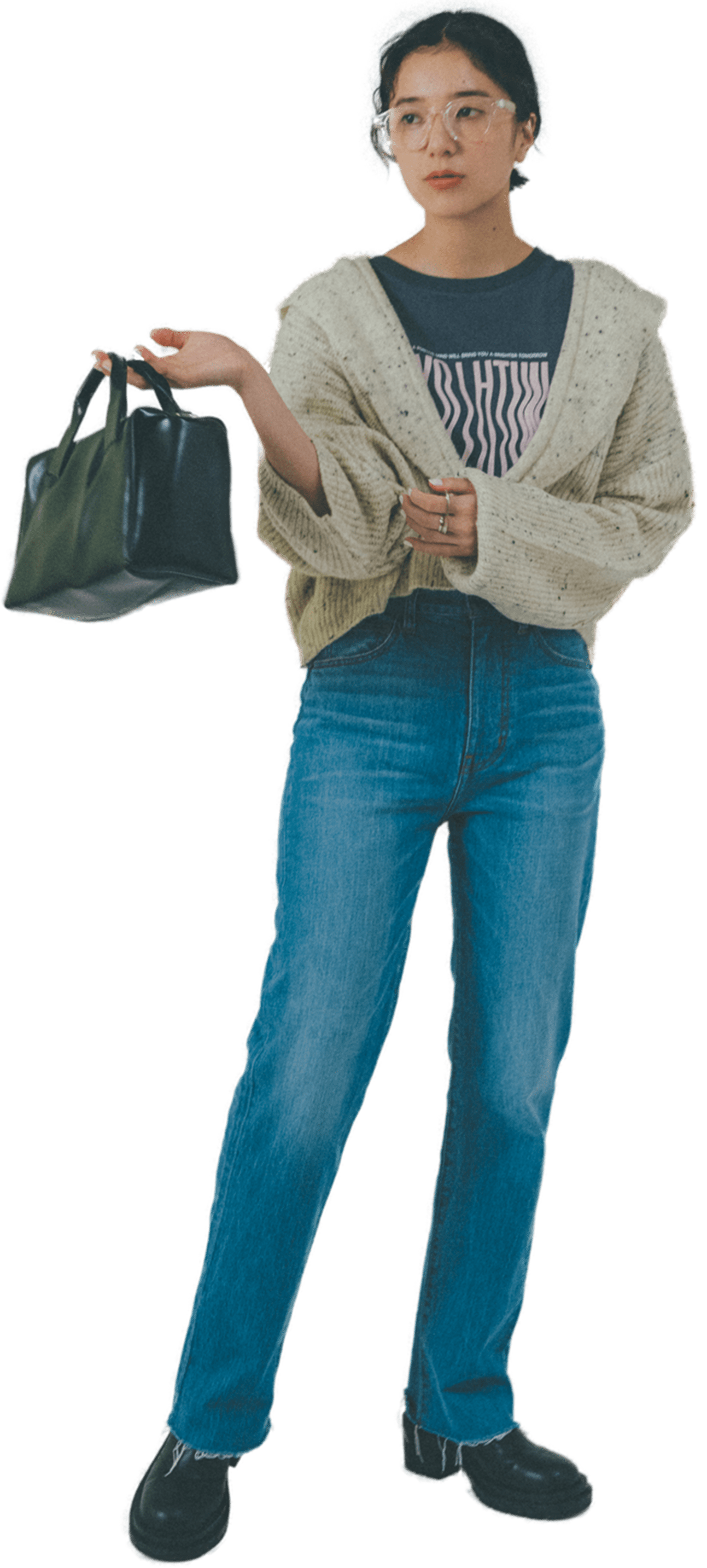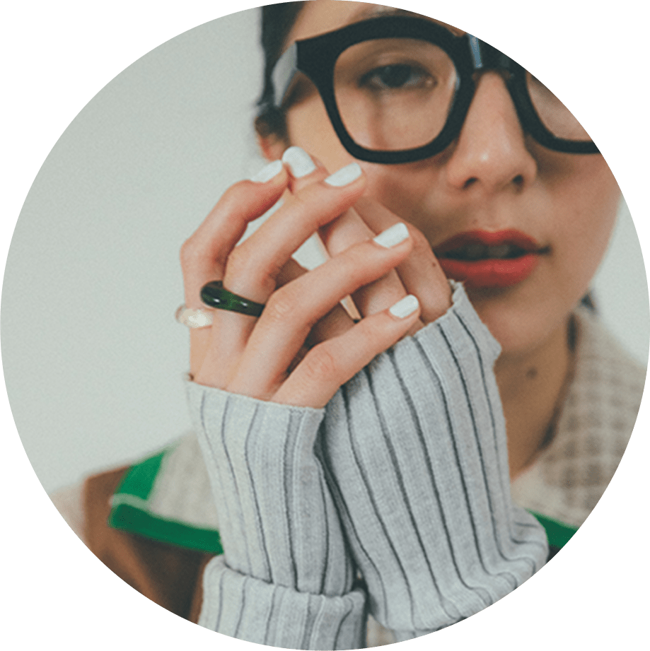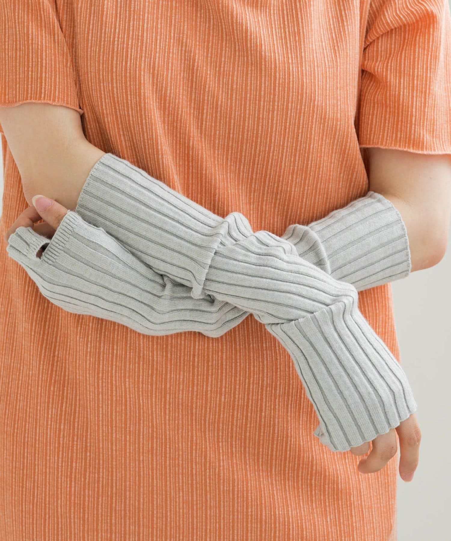スタイリングにトレンドの小物めがねとアームウォーマーをプラスすることで色のメリハリをつけました。