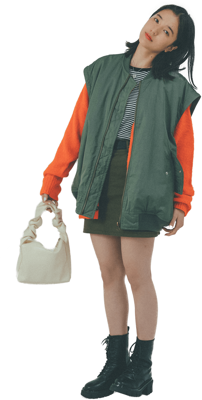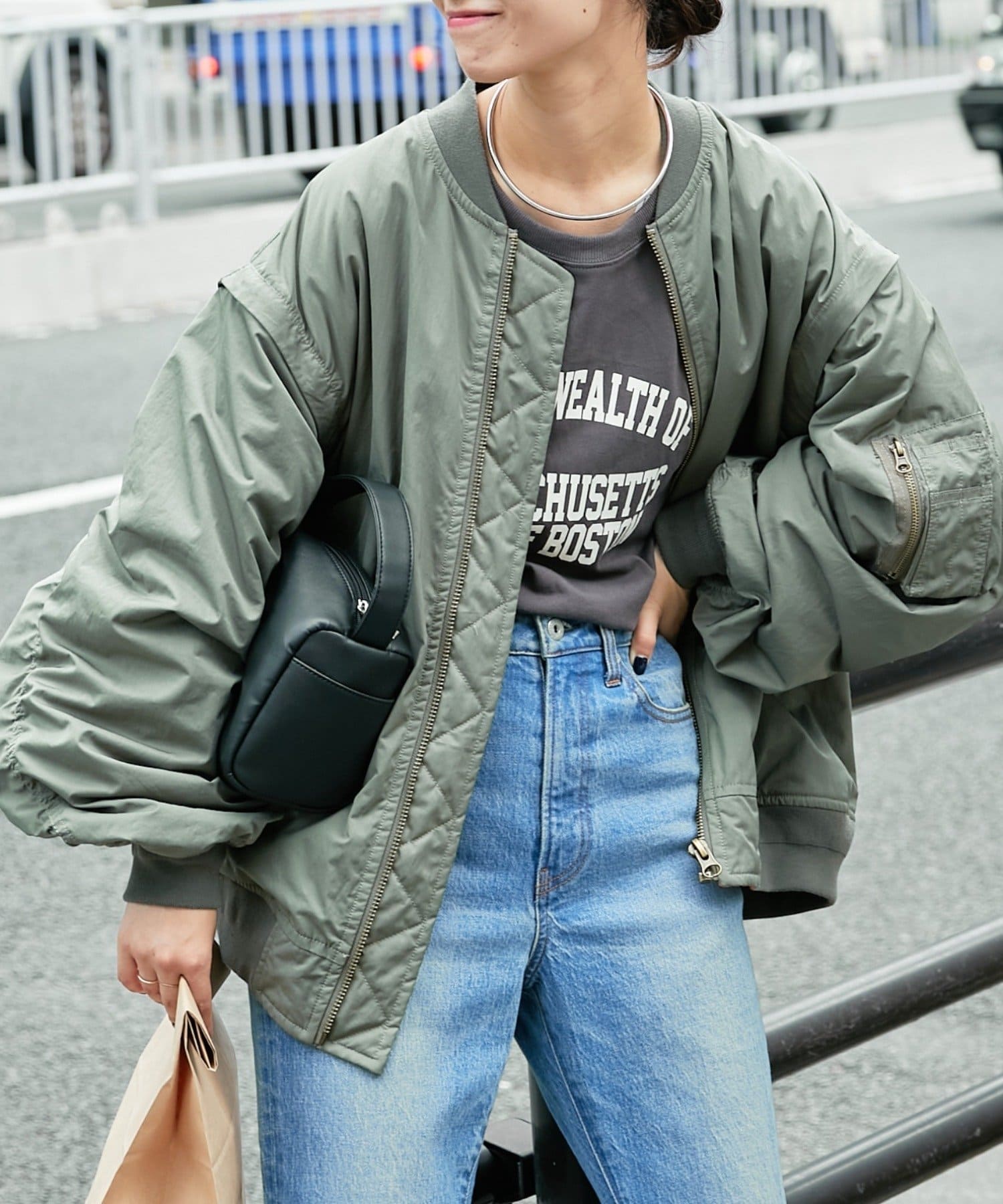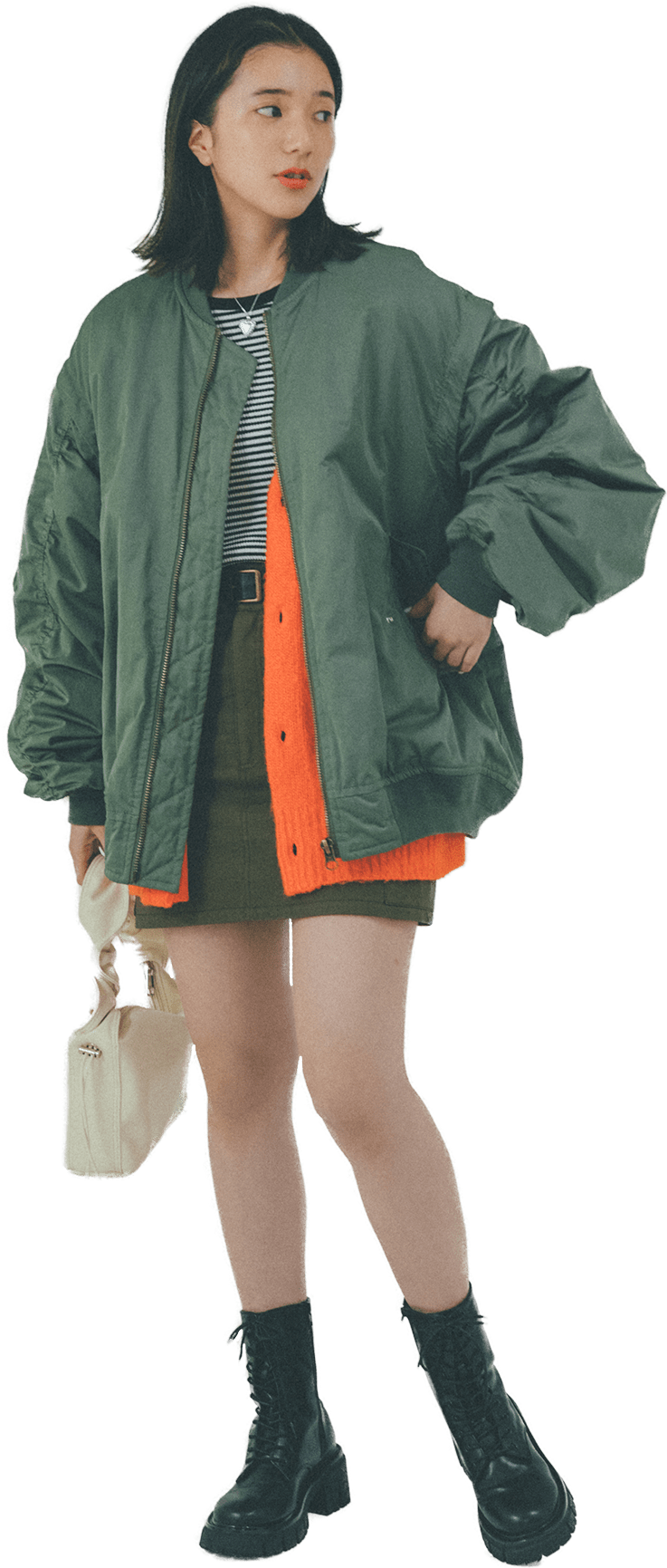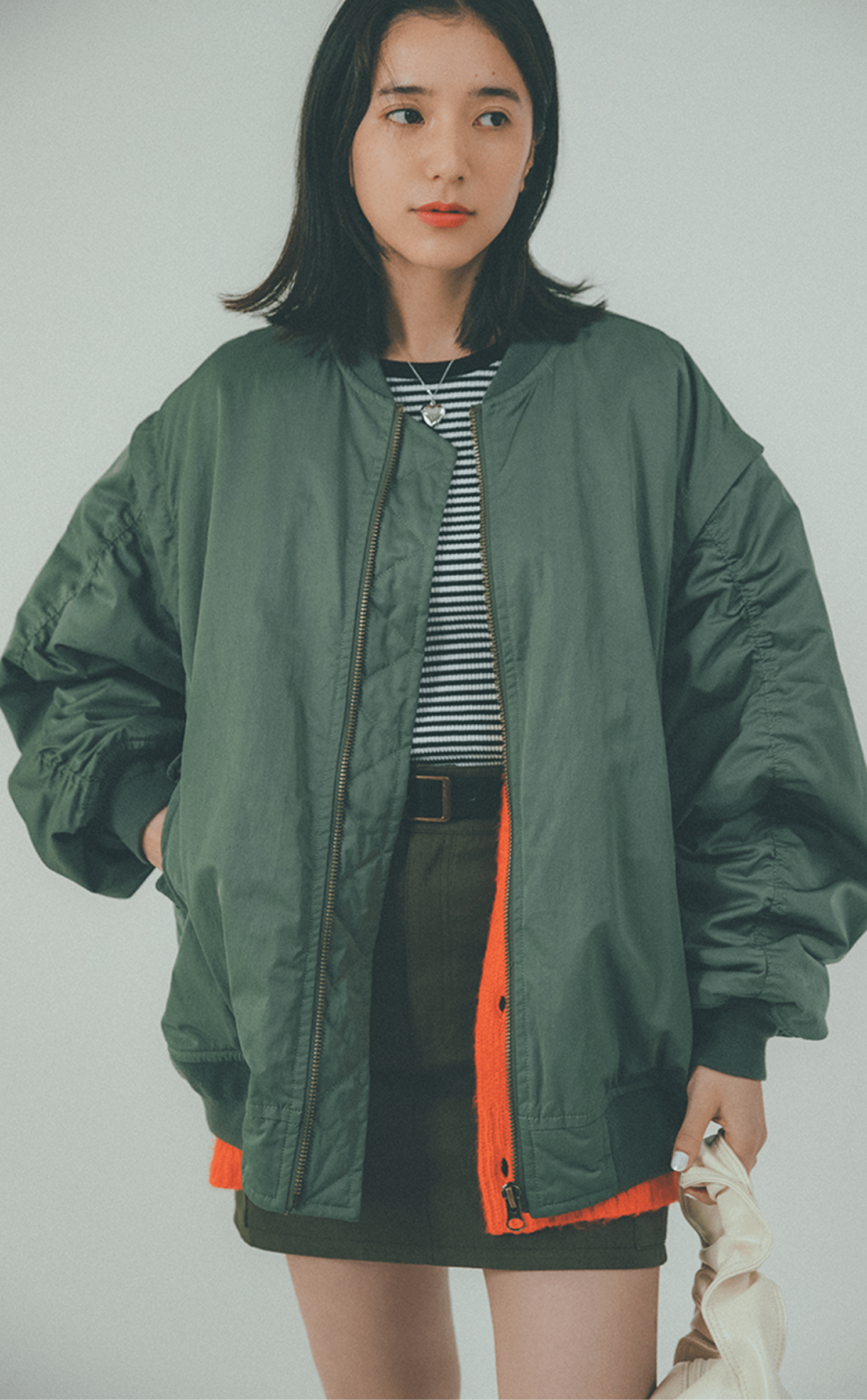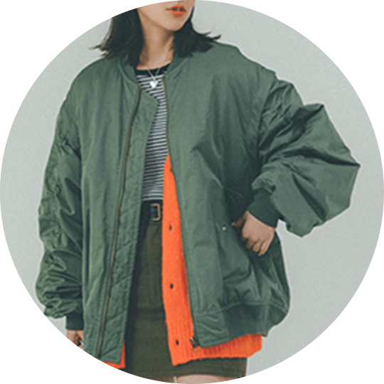 MA-1とスカートのカラーをワントーンでまとめ、情報量が多くならないようにコーディネート。